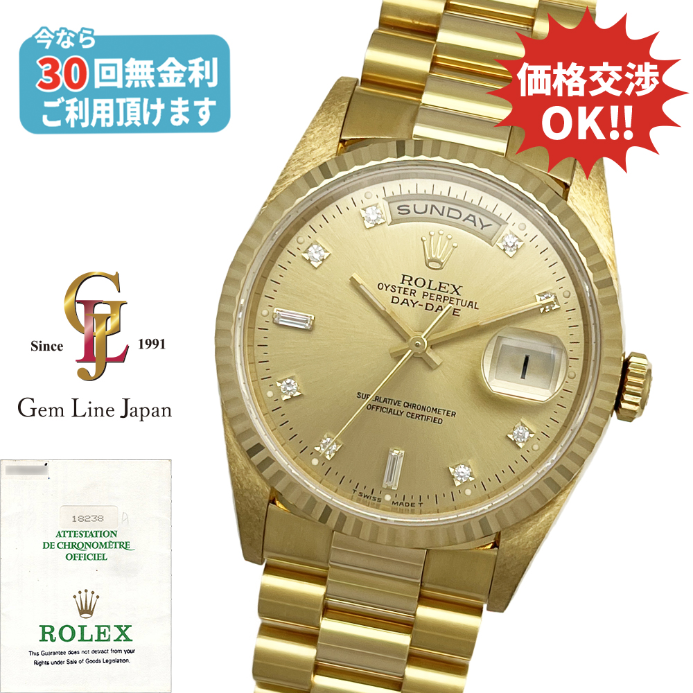 ロレックス デイデイト 118348 K番 ベゼル/センターブレス 純正ダイヤ 金無垢 グリーン バー 美品 ギャラ付 メンズ 自動巻 時計