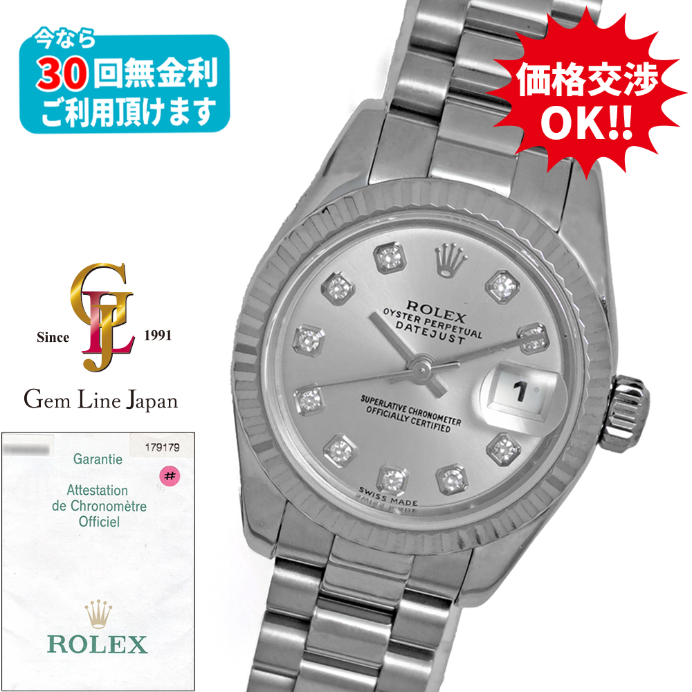 ロレックス デイトジャスト 179179G Y番 ホワイトゴールド無垢 10P純正ダイヤ シルバー レディース 自動巻 時計