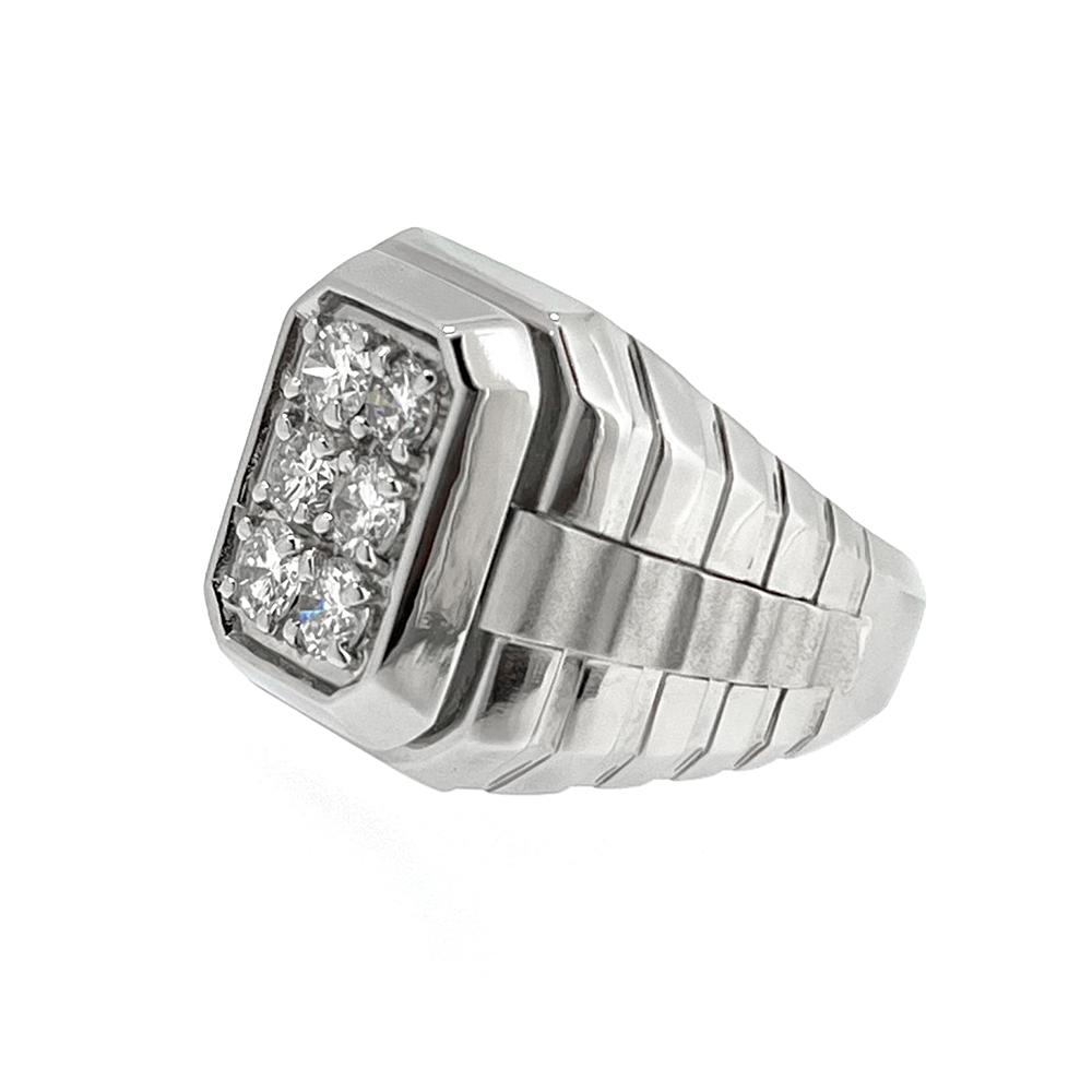 Pt900 ダイヤモンド 1.17ct メンズリング が入荷しました。6石トータル 1.17ctの上質なダイヤモンドをセッティングした非常にゴージャスなリングです。サイドは立体的な仕上げでセンター部分は艶消しになっており、洒落たデザインがエレガントな大人の雰囲気を演出してくれます。
