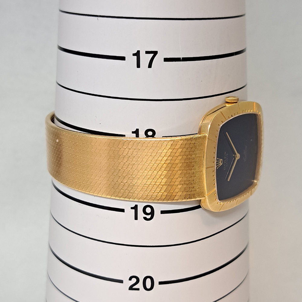 ヴィンテージ ロレックス チェリーニ 4320 ブルーグラデーションが入荷致しました。金無垢素材に深味と艶やかさを兼ね備えた美しいブルーグラデーションダイヤルが高級感を醸し出してくれます。ルーペで拡大するとベゼル等に微細な傷が御座いますが、製造年等から考えると綺麗な状態です。こちらの商品はあえてノンポリッシュで保管しております。ポリッシュをご希望の方はお申し付け下さい。