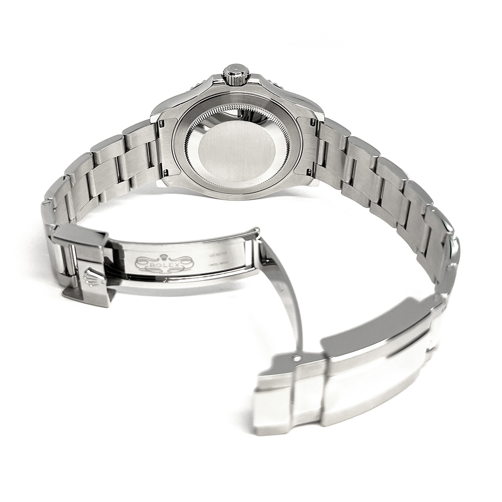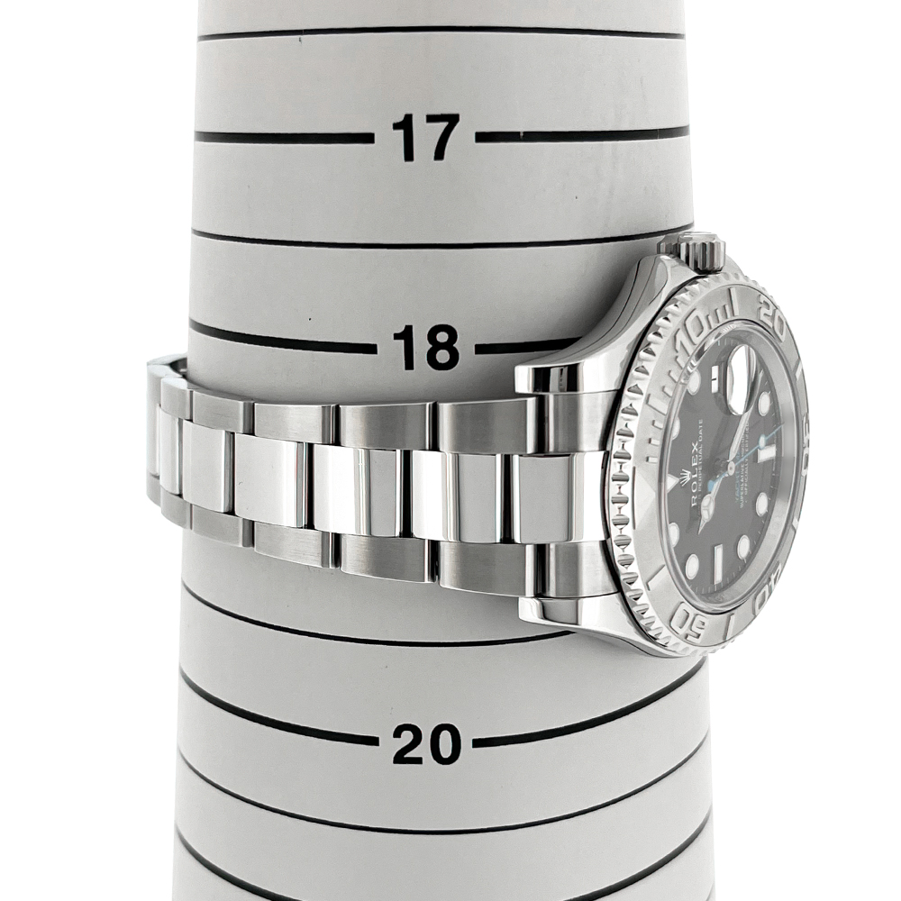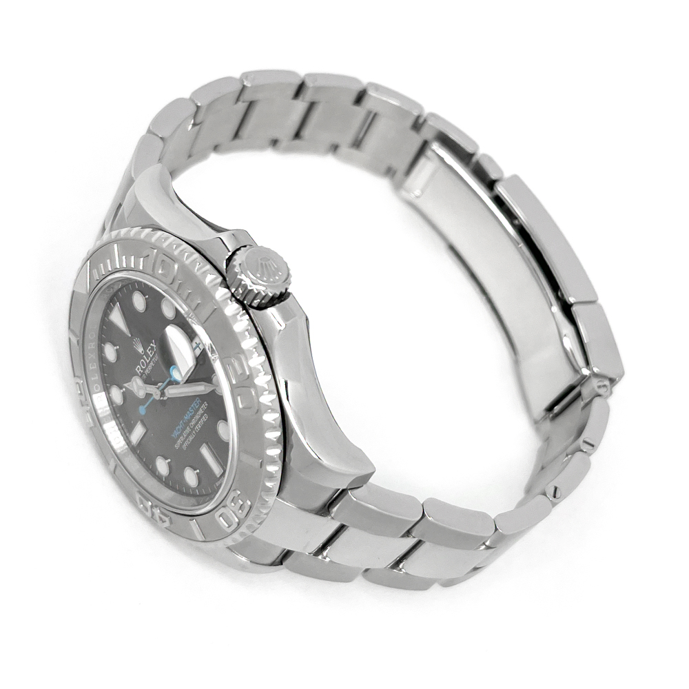 発売以降ヨットマスター人気を牽引するほどのアイコニックカラーに成長したダークロジウム(スレート)文字盤は、水色の秒針やモデル表記とのコントラストがとても綺麗でスッキリしており、視認性も抜群です。