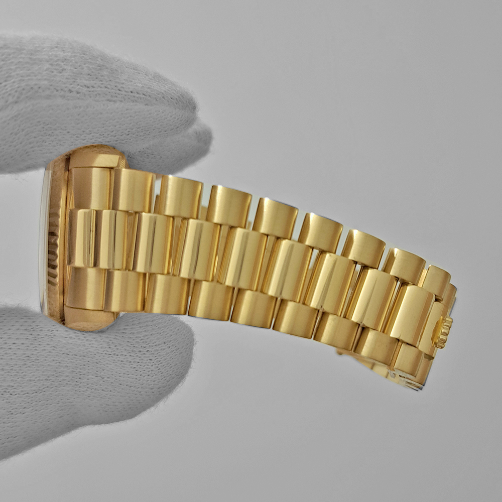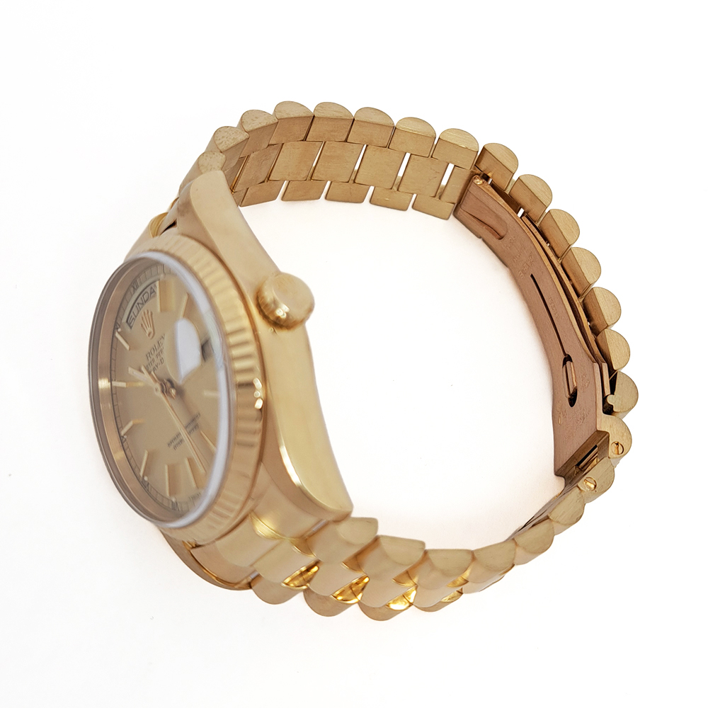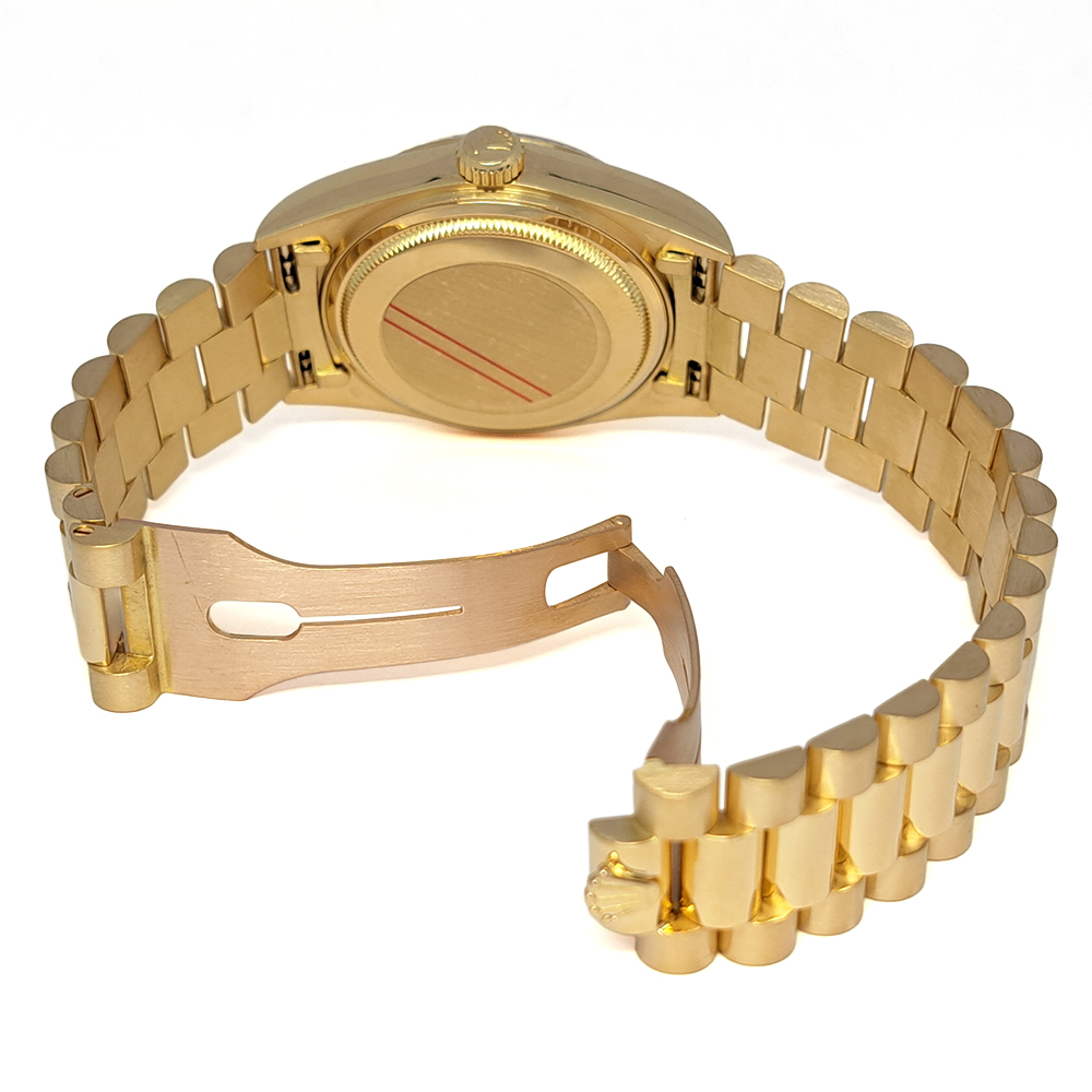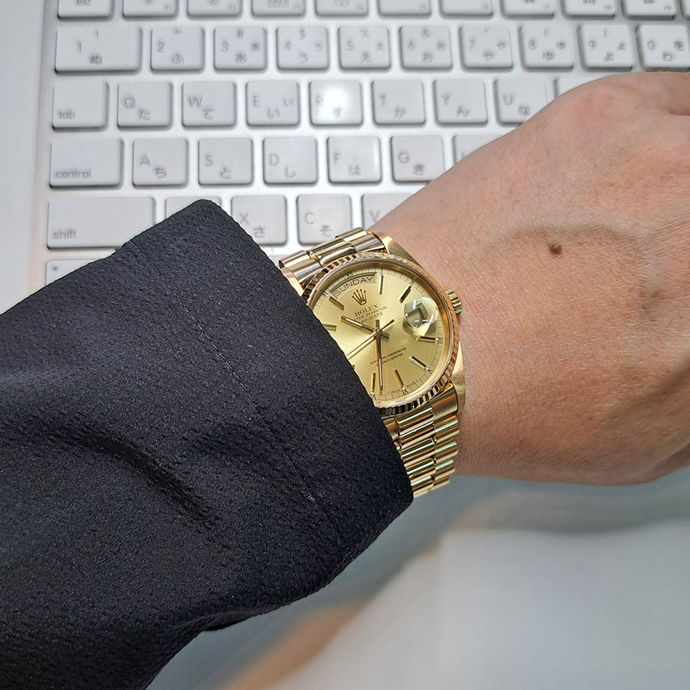 ロレックス デイデイト 18038 シャンパン バーが入荷致しました。ロレックスの最高級モデルであるデイデイト、金無垢素材に日付表示に加えフルスペルの曜日表示を備えた機能性と高級感を併せ持ったハイエンドモデルです。こちらの商品はルーペで拡大すると風防ガラスに極微細なカケがありますが、肉眼では殆ど気にならない程度で、それ以外は目立った傷等の無い綺麗な状態です。