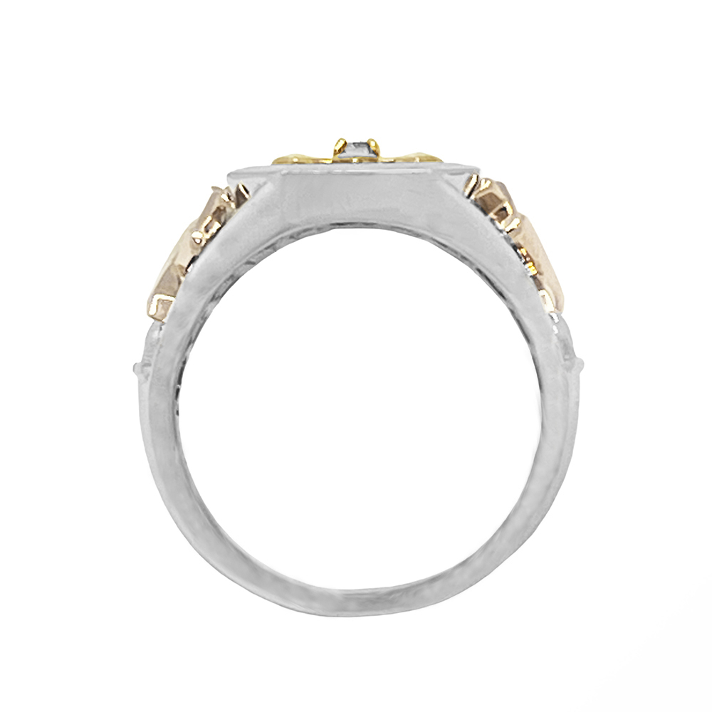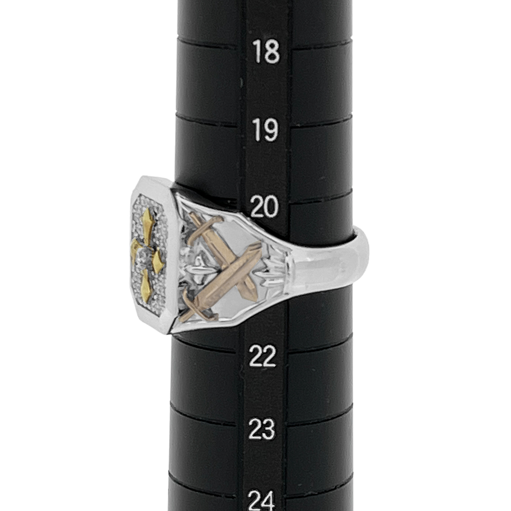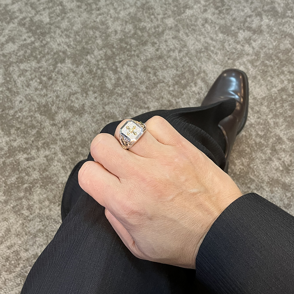K18/Pt950 ダイヤモンド メンズ リングが入荷しました。印台モチーフの中央にクロスと両サイドにソードを模したデザインです。中央の一粒ダイヤモンドは良質で無色透明に近い輝きの良いルースをセッティングしており、周囲には上質なパヴェダイヤモンドを敷き詰めたゴージャスなメンズリングです。(クロスとソード部分はK18になります。)