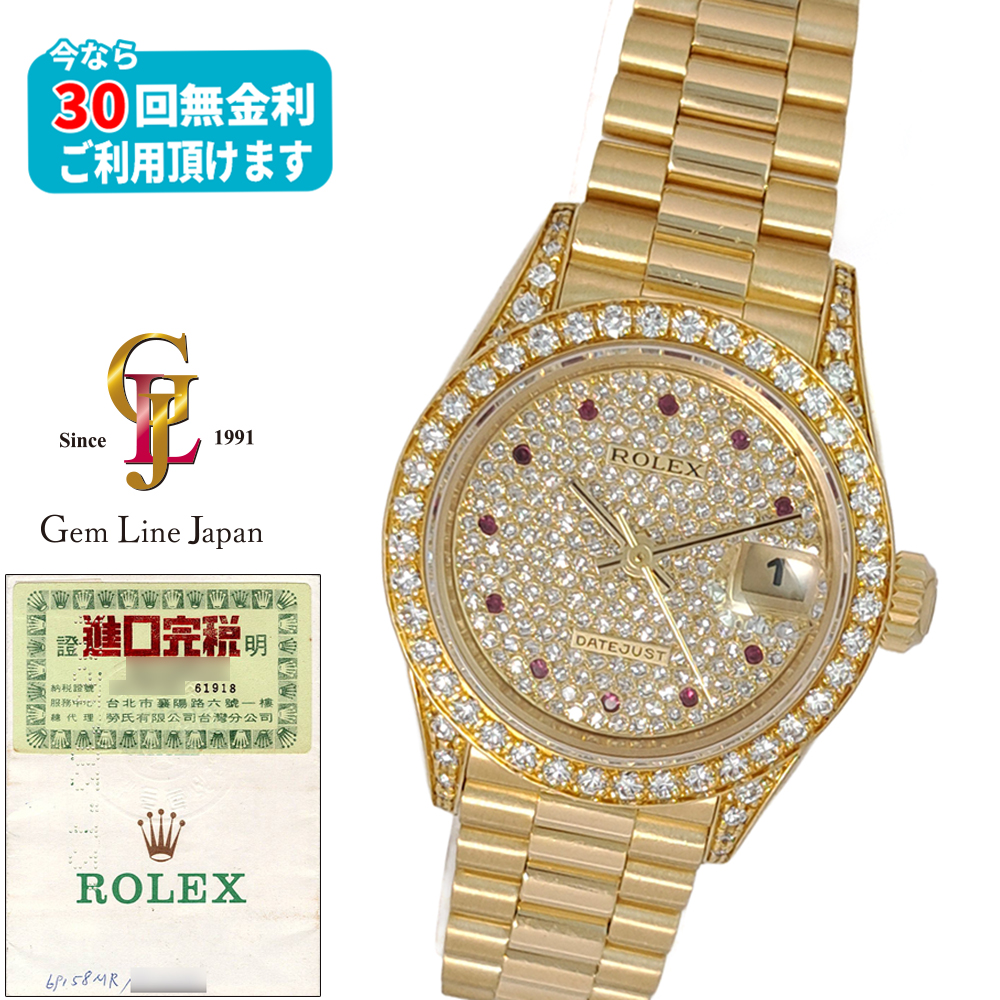 OH済 ロレックス デイトジャスト 69158ZR パヴェダイヤ ラグ・ベゼルダイヤ 11P純正ルビー 金無垢 ギャラ付 レディース 自動巻 時計