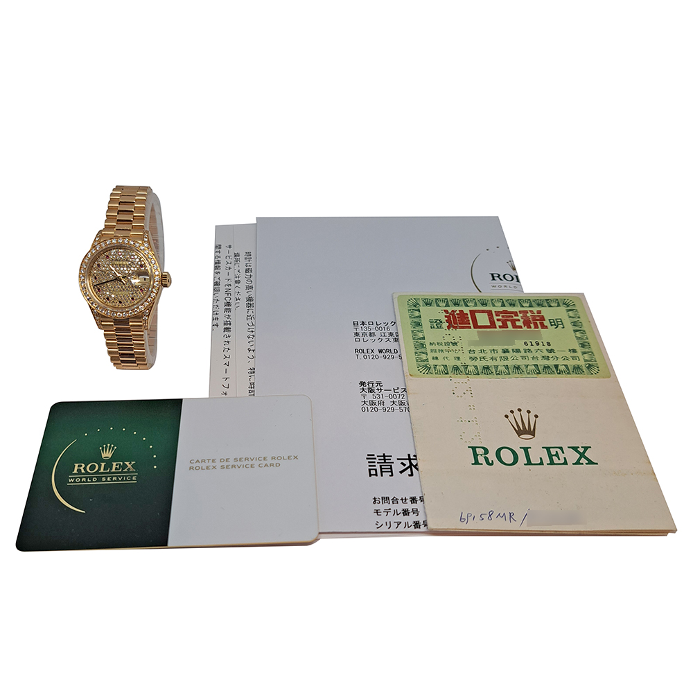 ロレックス デイトジャスト 69158ZR パヴェダイヤが入荷致しました。ダイヤルにはびっしりとパヴェダイヤと11P純正ルビーが、ベゼルとラグにもダイヤをセッティングしたロレックス レディースの中でも最高級のモデルです。こちらの商品は目立った傷等の無い綺麗な状態です。2025年10月にメーカーにてオーバーホールを実施しており、安心してご使用して頂けます。ギャランティに1991年2月に台湾にて購入した記載があります。