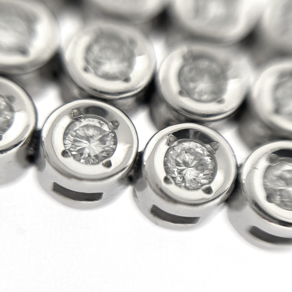 ダイヤモンドはプラチナで囲うようにセットされており、ダイヤモンドの輝きを反射するように計算されています。手首に沿うようにしなやかに作られていますので、着け心地良好です。