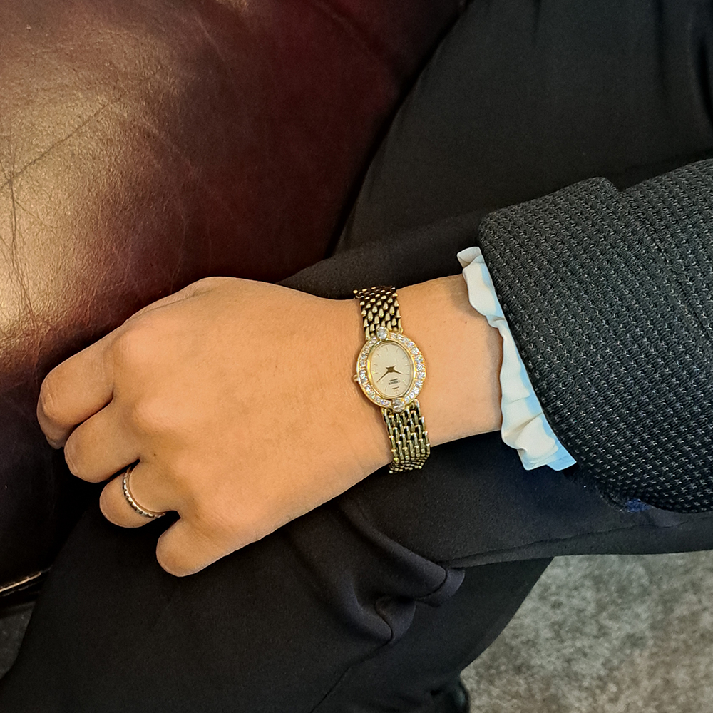 光の当たる角度により、ダイヤベゼルとオパールダイヤルがキラキラと輝き特別な日の装いを艶やかに彩ります。カジュアルスタイルにも好相性で、幅広いシーンで活躍してくれます。