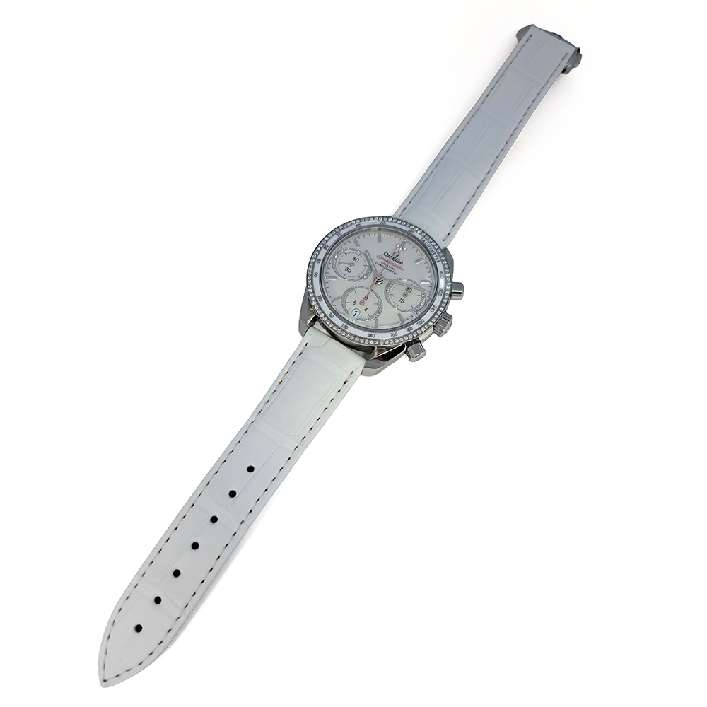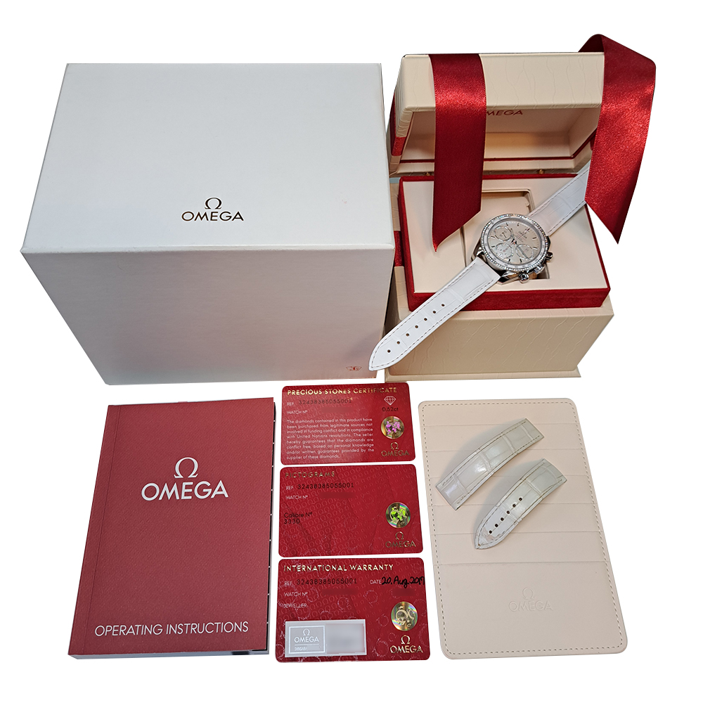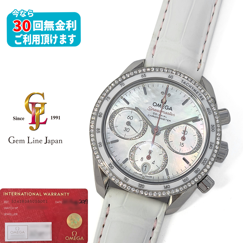 オメガ スピードマスター 324.38.38.50.55.001が入荷致しました。スピードマスターの特徴であるクロノグラフに光の当たる角度により色んな表情を見せるシェルダイヤル、さらにベゼルにはびっしりと純正ダイヤモンドをセッティングした、スポーティーでありながらエレガントなモデルです。ギャランティに2017年に国内正規販売店にて購入した記載があります。こちらの商品は目立った傷等の無い綺麗な状態です。
