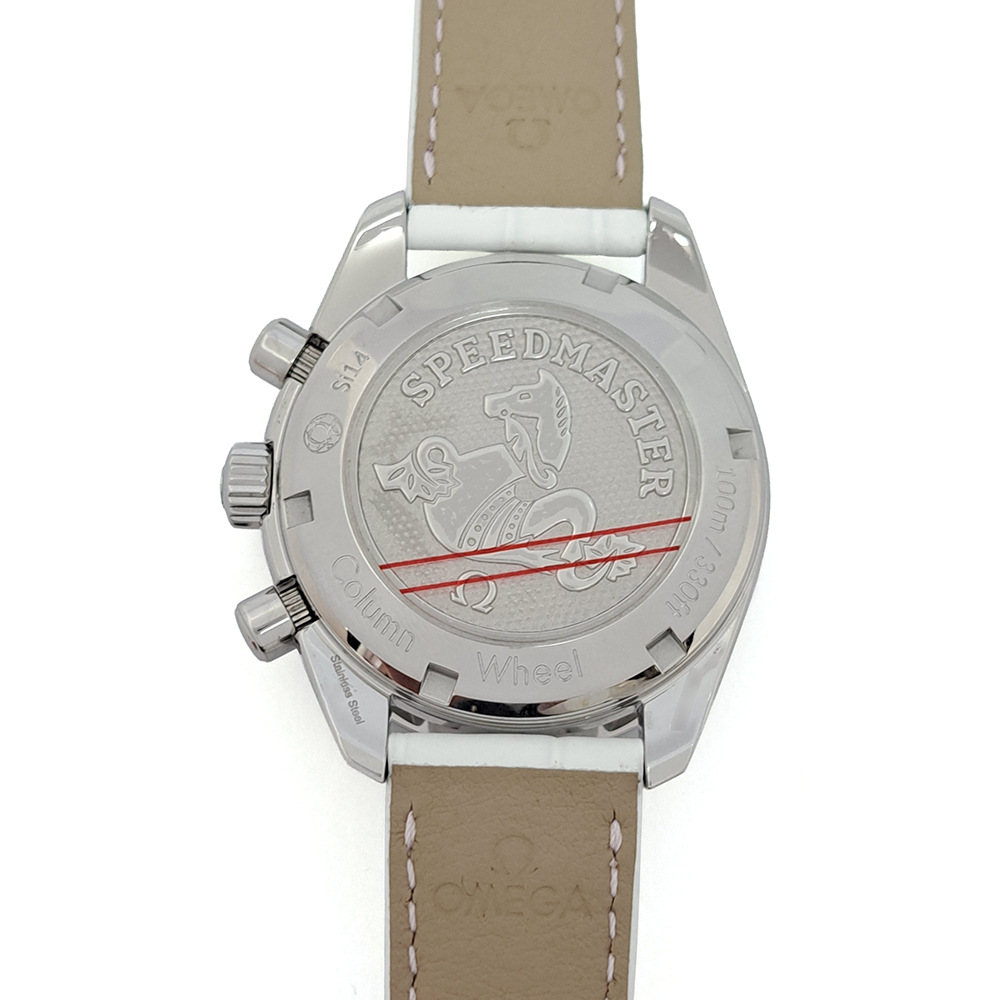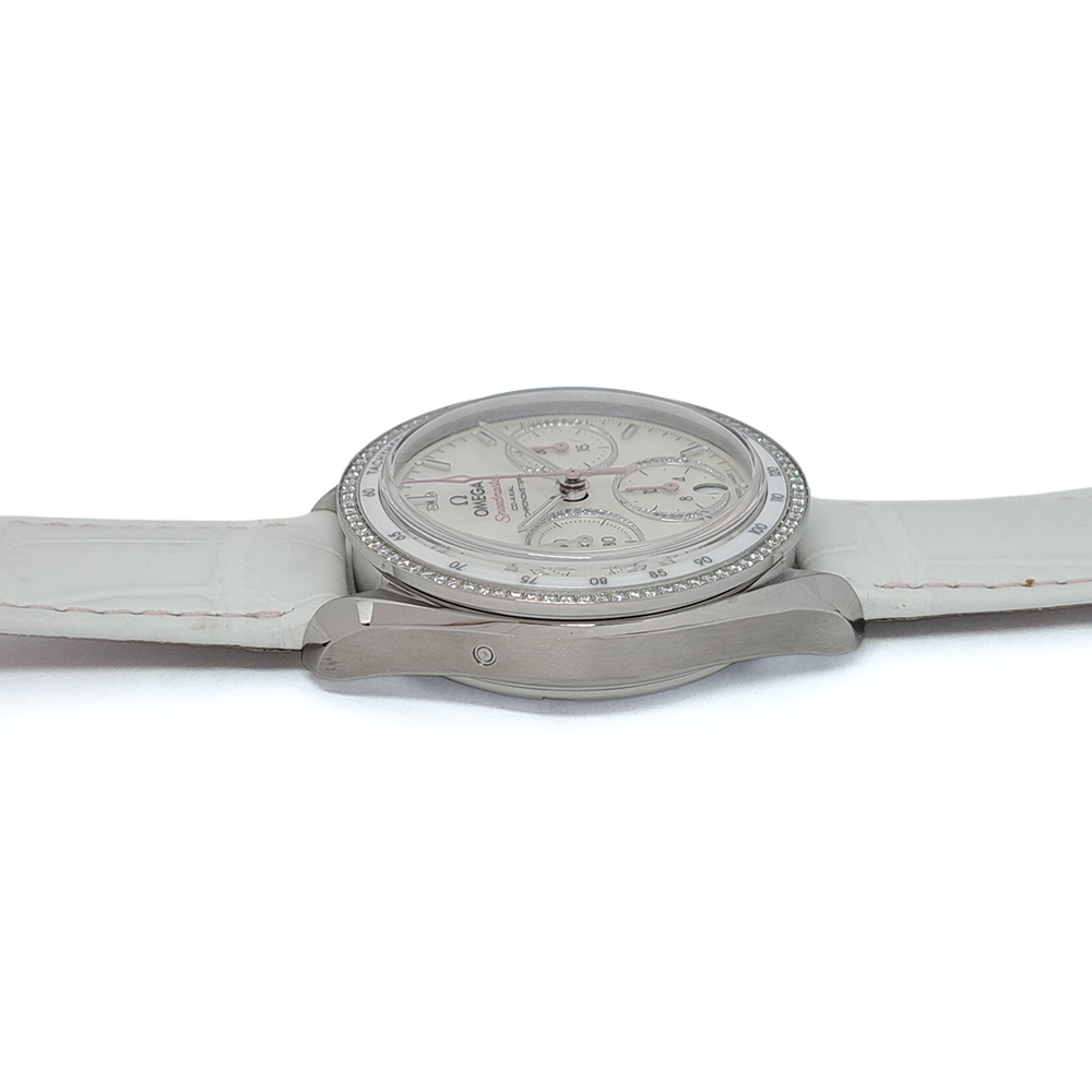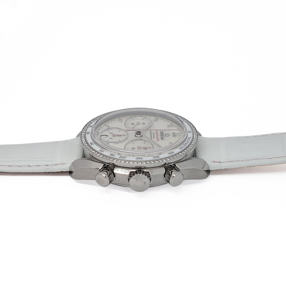 美しいシェルダイヤルとダイヤモンドベゼルが特徴的なモデルで、秒針・インダイヤルの針(2カ所)・スピードマスターのロゴが淡いピンク色に塗装されており、さり気ない所までお洒落な逸品です。