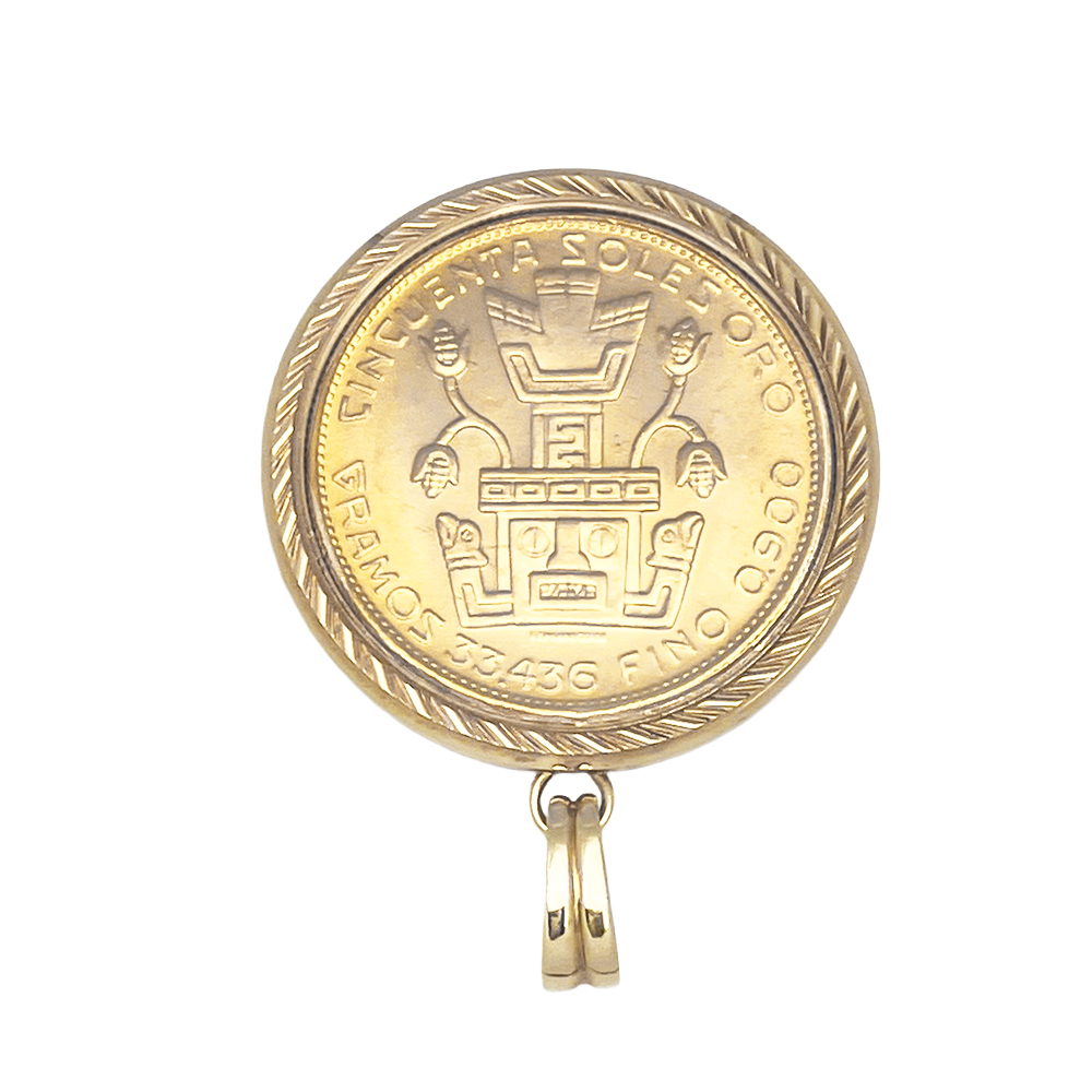 ペルー造幣局発行 インカ インディアン 金貨 コイン トップが入荷しました。 表面にインカ王の左向き頭像、裏面にインカン・ディアティと呼ばれる神様の像を描いた金貨を使用しイエローゴールドの枠で留めたコイントップです。