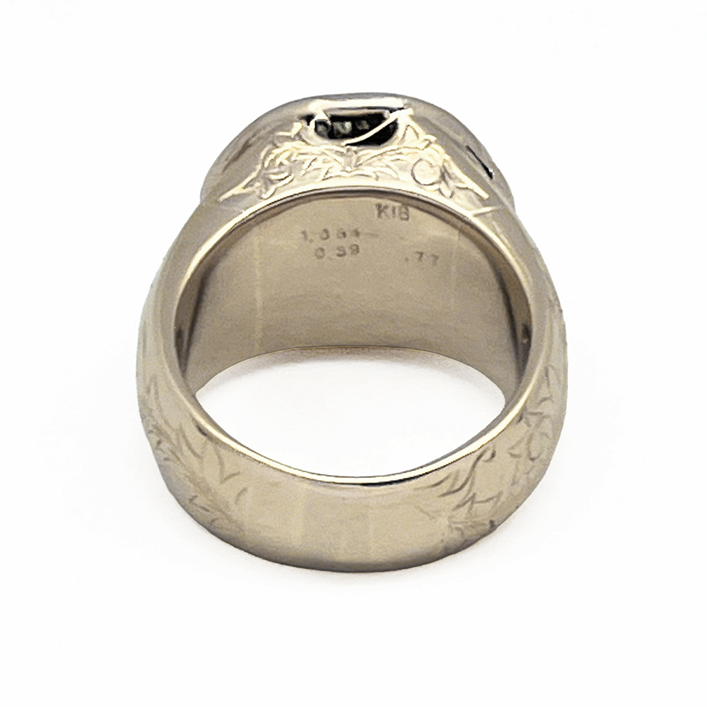 イエローゴールドの輝きと、きらきらと輝くダイヤモンドが手元を豪華に演出してくれます。リング側面と上部にには唐草模様のデザインが彫られています。指通りもなめらかで着け心地も最高です。男性のオシャレをワンランクアップしてくれるジュエリーです。