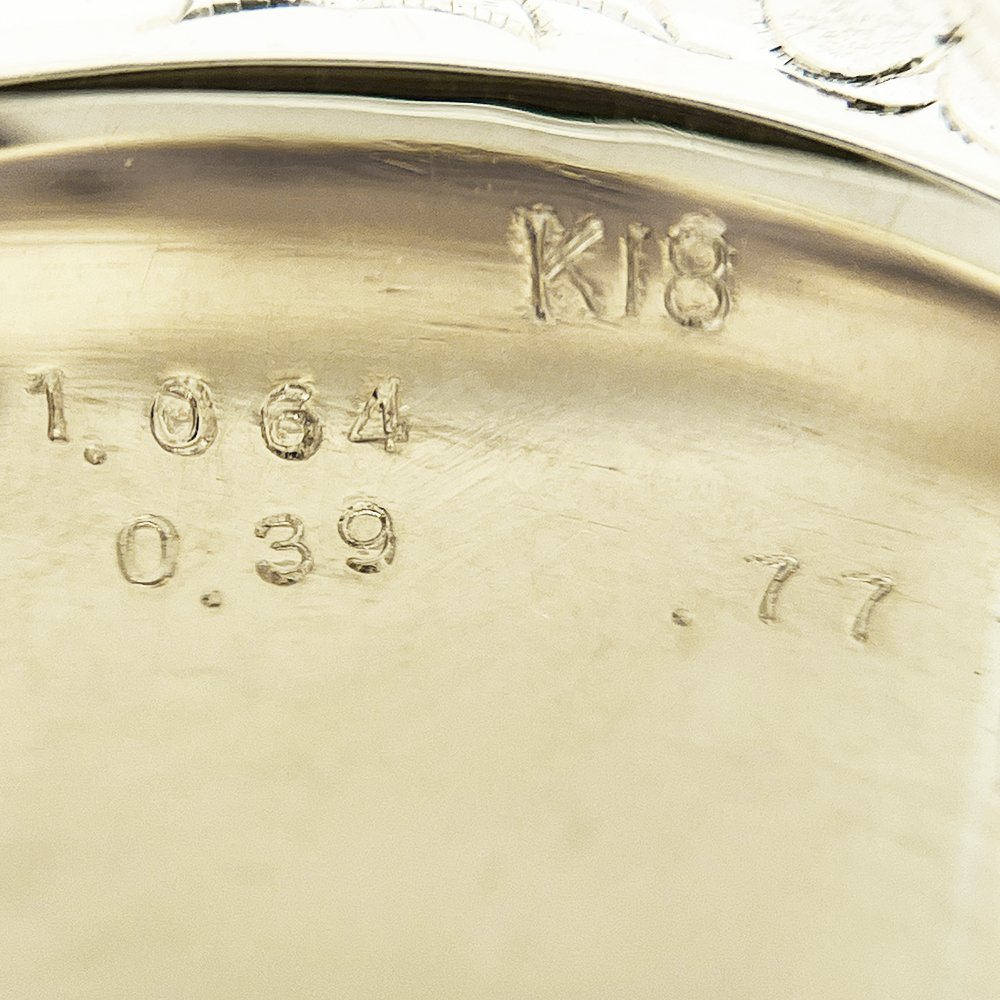 K18 ダイヤモンド メンズリングが入荷しました。輝きの良い一粒ダイヤモンド 1.064ctをセンターにセットし、周囲に渦巻き型にバゲットカットのダイヤモンドを使用した豪華なメンズリングです。