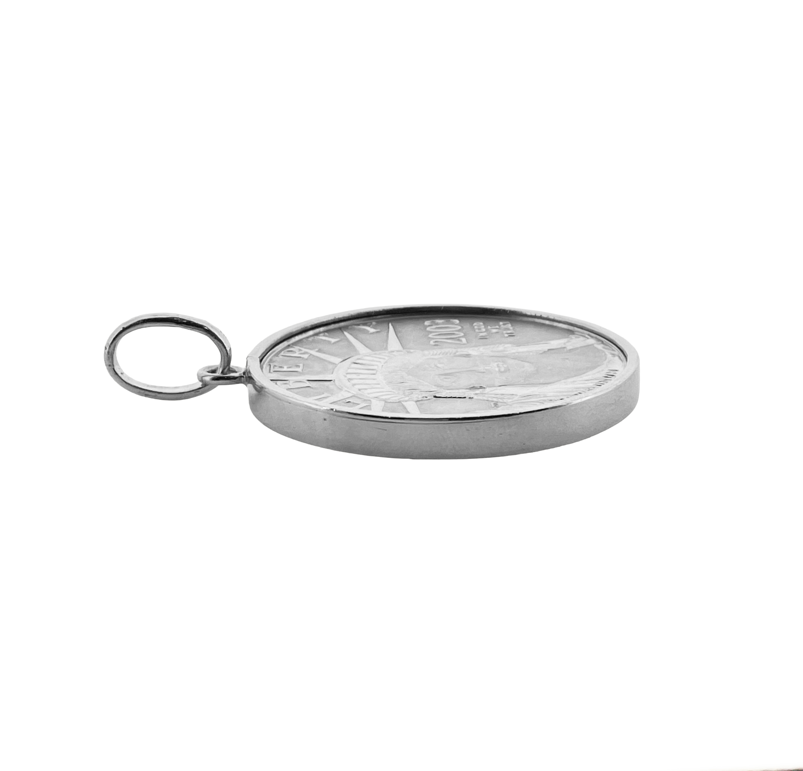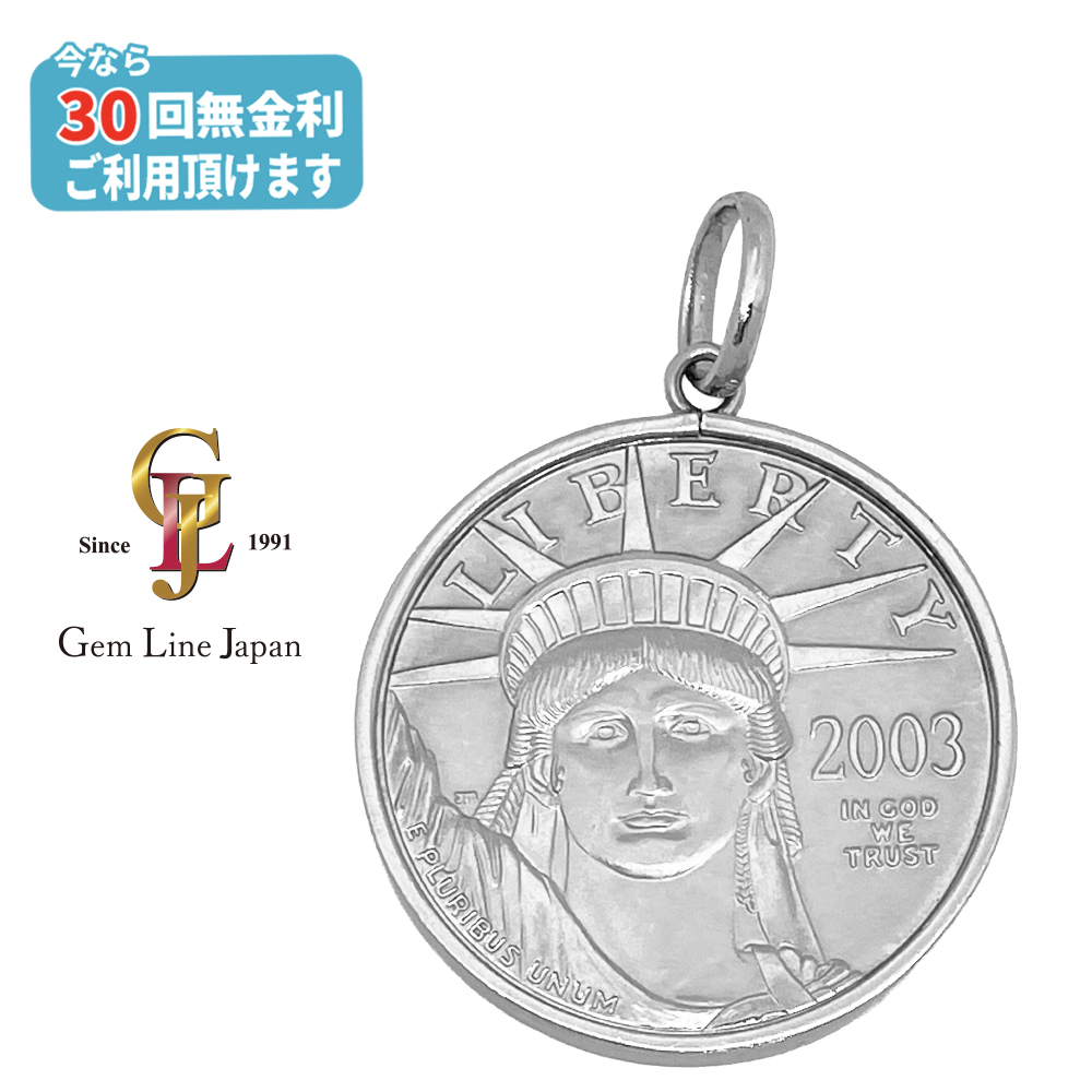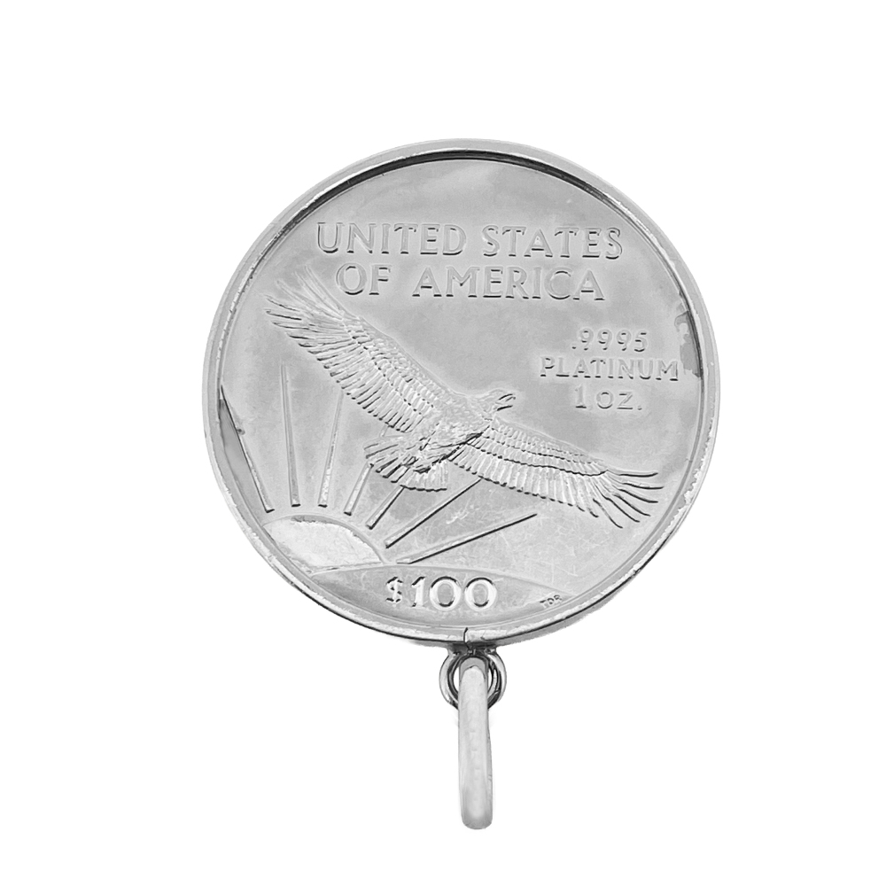 プラチナ貨は現在購入出来づらい状況となっています。イーグルコイン自体も流通量が少なくとても貴重な一品です。 装着すると胸元に男性らしい印象を演出してくれます。※装着写真のチェーンは別売です。50g・60cmのPt850デザインネックレスを使用しています。バチカンは別途料金にて加工も承っており大きくする事も可能です。お気軽にお問合せくださいませ。