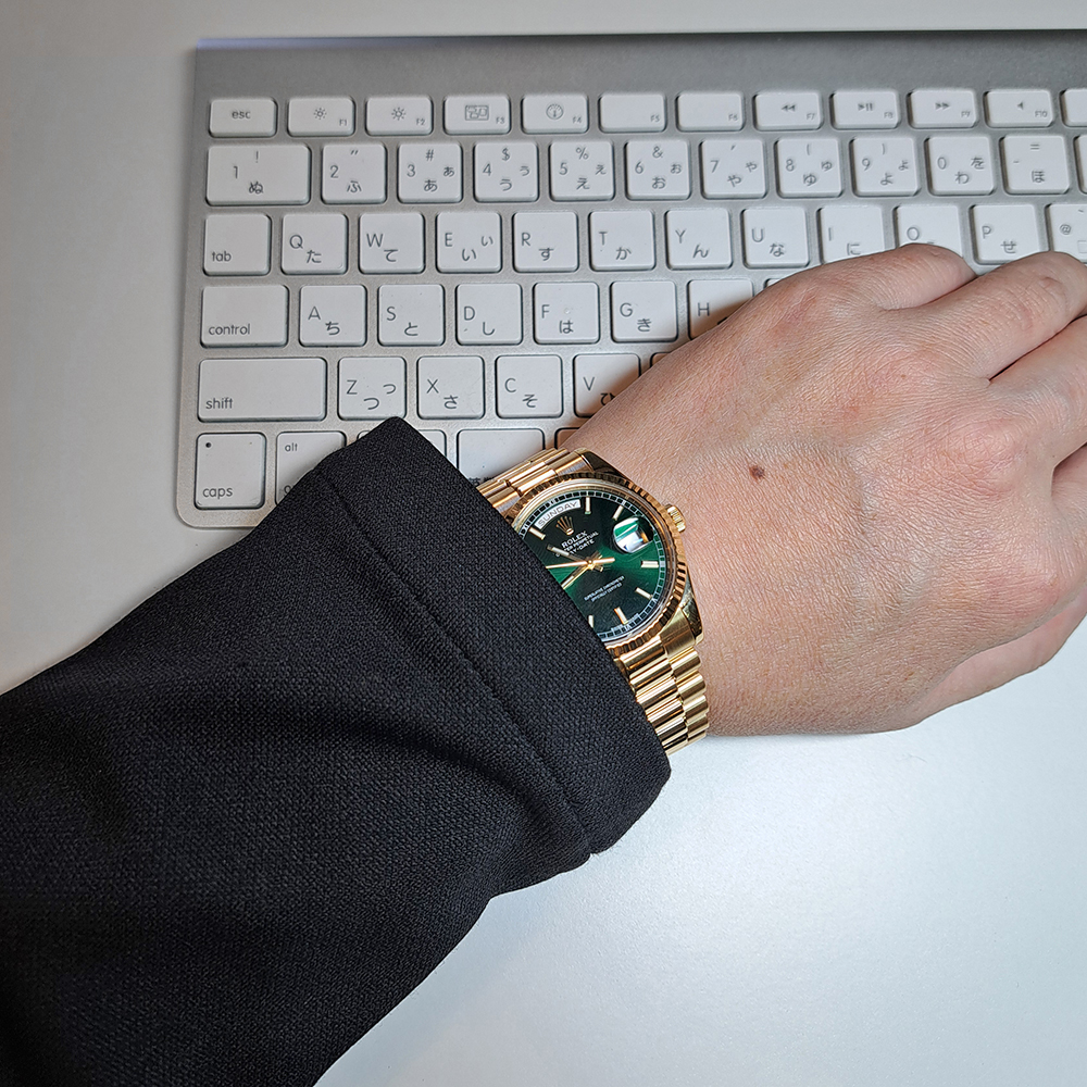 ロレックス デイデイト 118238 グリーン が入荷致しました。ロレックスカラーのグリーンダイヤルが特徴的で、光の当たる角度により、エメラルドの様な発色をし金無垢素材との相性も抜群です。こちらの商品はルーペで拡大するとベルトとベゼルに打痕や傷が御座いますが、それ以外は目立った傷等の無い綺麗な状態です。ギャランティに香港にて購入した記載があります。2025年11月にメーカーにてオーバーホールを実施しており、安心してご使用して頂けます。