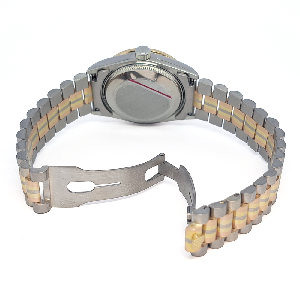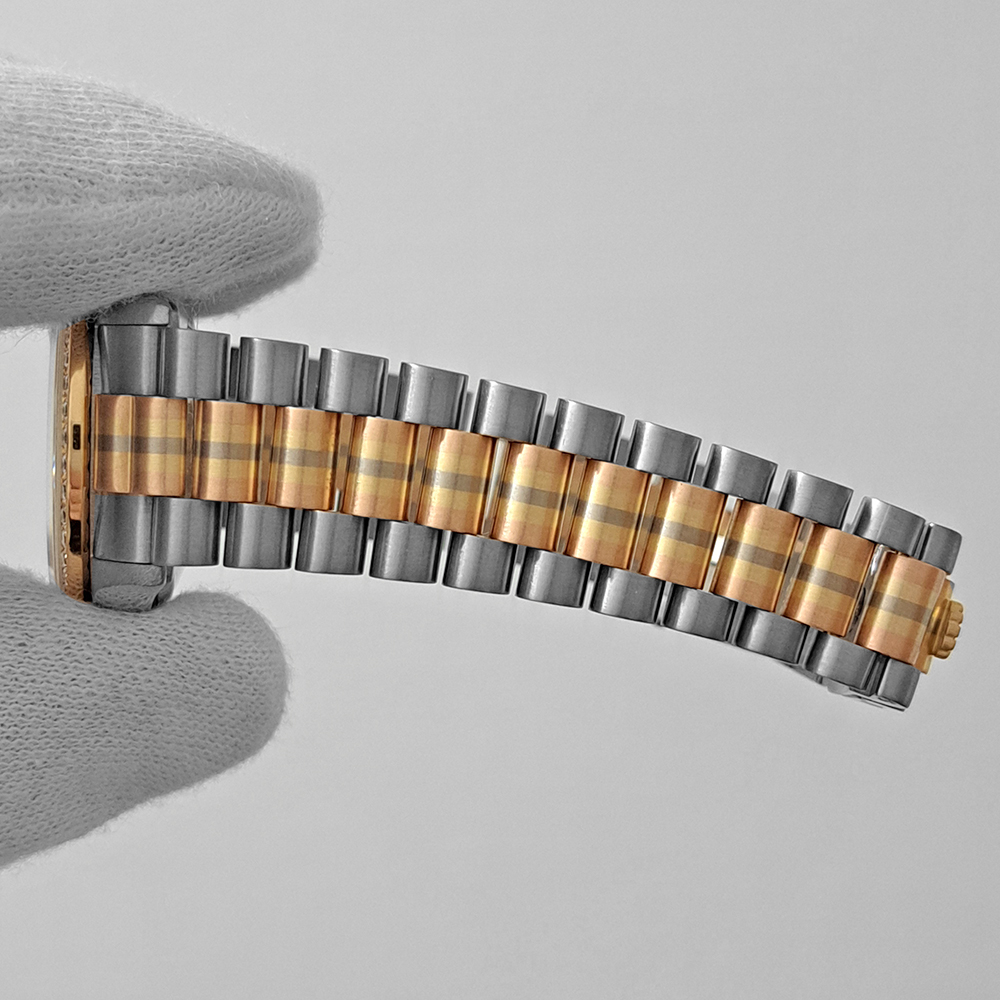 ロレックス デイトジャスト 68289G BIC トリドールが入荷致しました。シャンパンゴールドの文字盤には10P、さらにベゼルにも一周、純正ダイヤモンドを施した高級感のある時計です。ブレスレットにはイエローゴールド、ホワイトゴールド、ピンクゴールドの3種類のゴールドを仕様されて珍しいタイプのブレスレットとなっております。こちらの商品はルーペで拡大すると風防ガラスに微細なカケが御座いますが、肉眼ではそれ程気にならない程度で、それ以外は目立った傷等の無い綺麗な状態です。