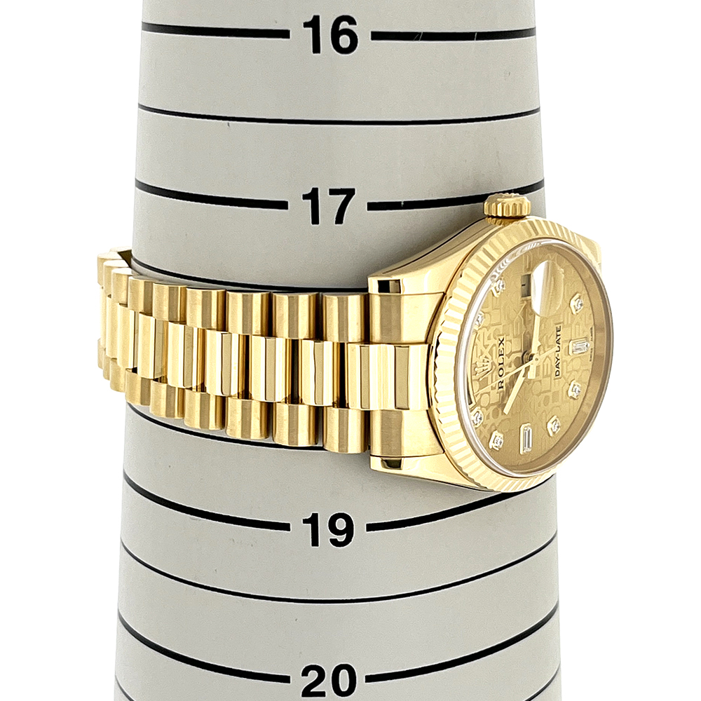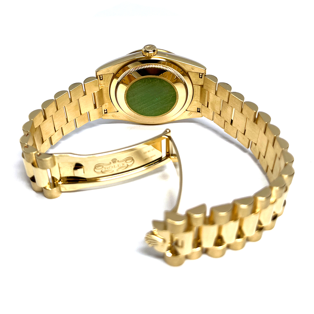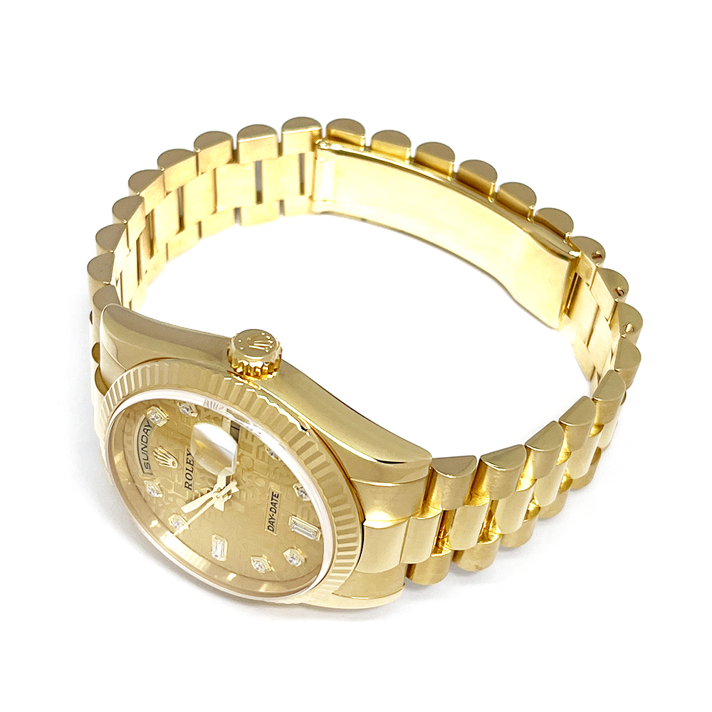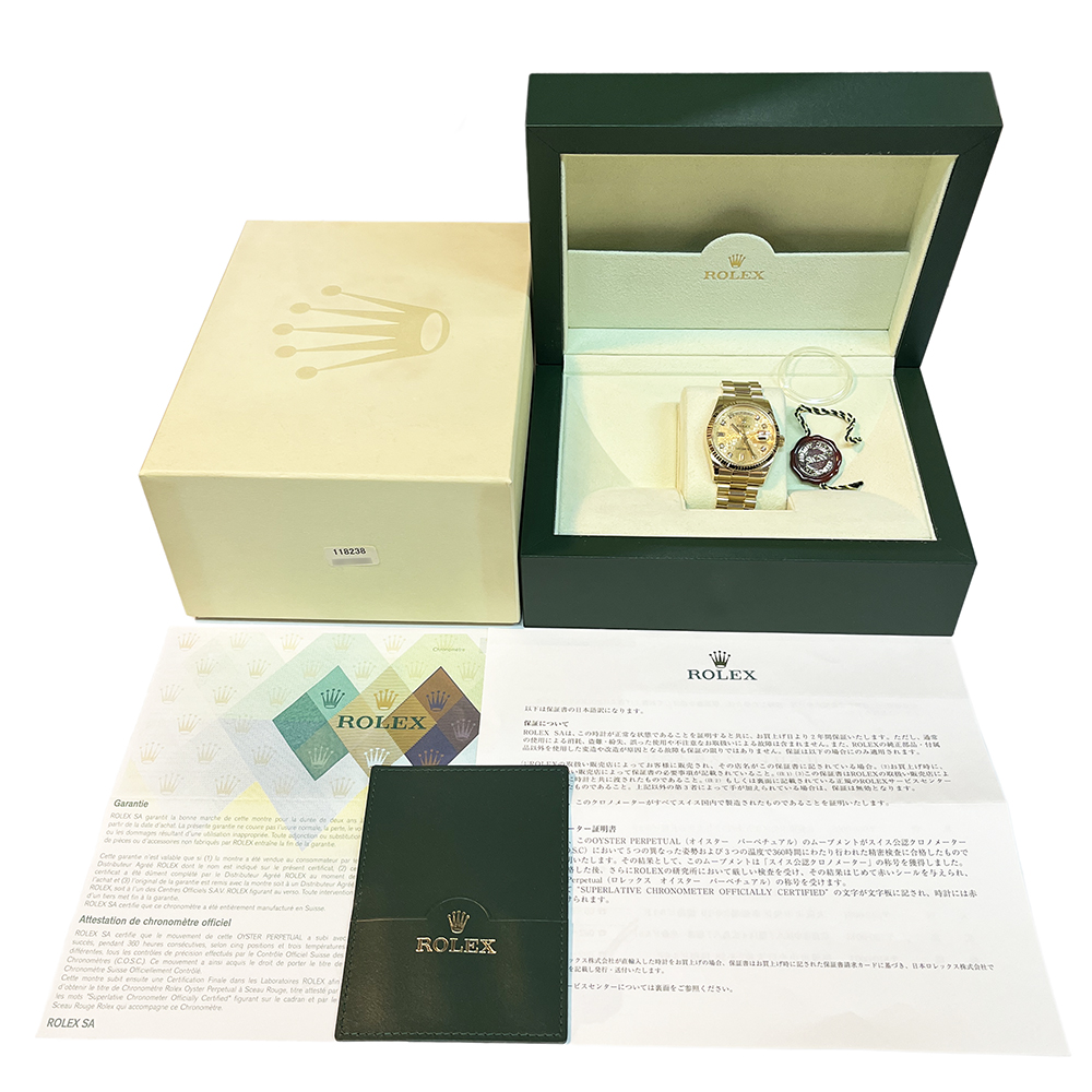 ロレックス デイデイト 118238A が入荷しました。ロレックスで唯一のフルスペルの曜日表示を備えるデイデイトは、手にしたユーザーにワンランク上のステータスと満足感を与えてくれます。腕元に馴染む36mmイエローゴールド無垢のケースは高級感が溢れ、最高峰モデルに相応しい仕上がりです。本品は目立つ傷のない非常にきれいな状態です。ギャランティーに2006年8月に国内正規販売店で購入した記載がございます。