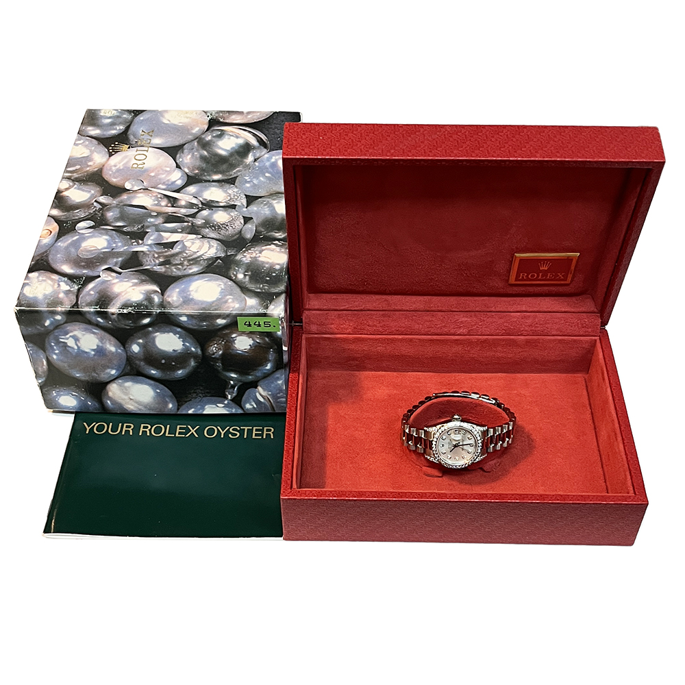 ロレックス デイトジャスト 179159G が入荷しました。ドレスウォッチのアイコン的存在として抜群の知名度を誇るレディ デイトジャスト。 現行モデルの発表とともに惜しまれつつも生産終了となったこちらの26mmサイズは現在でも根強い人気を誇るレディースサイズです。 こちらのモデルはインデックス・ベゼル・ラグまで贅沢にダイヤモンドをセッティングした豪華な1本です。本品はルーペで拡大して確認すると、風防ガラスに極微細な欠けが複数ありますが、肉眼ではほとんど見えない程度で視認性に問題ありません。ケース・ブレスレットに目立つ傷はなく非常にきれいな状態です。カレンダー10分早く切り替わります。