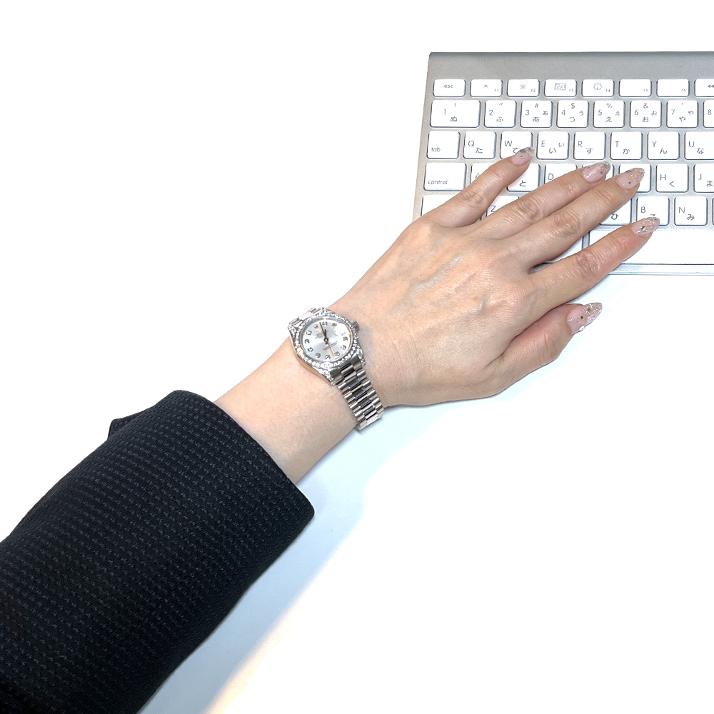 ホワイトゴールドはSSモデルとは違う高級感溢れる重量感と派手になり過ぎない上品な輝きがあり、ダイヤモンドのきらめきが相まってエレガントな雰囲気を演出してくれます。