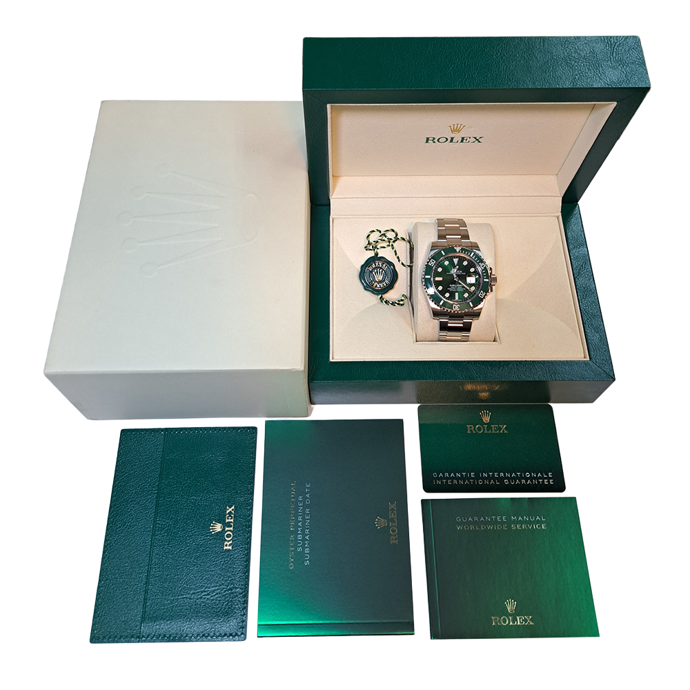 未使用 ロレックス サブマリーナ 116610LV が入荷致しました。通称グリーンサブやハルクと呼ばれるモデルで、ロレックスのコーポレートカラーである鮮やかなグリーンのベゼルとダイヤルが特徴的です。ダイヤルは光の当たる角度により実に美しくまるでエメラルドの様な発色をします。ギャランティに2020年に購入した記載があります。