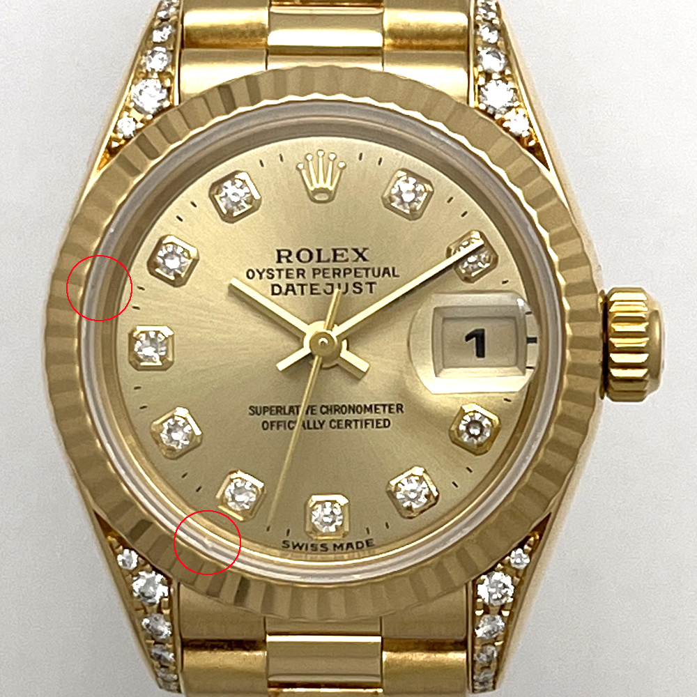 ロレックス デイトジャスト 69238G が入荷しました。ドレスウォッチのアイコン的存在として抜群の知名度を誇るレディ デイトジャスト。生産終了となったこちらの26mmサイズは現在でも根強い人気を誇るレディースサイズです。 こちらのモデルはインデックスとラグにダイヤモンドをセッティングしたゴージャスな1本です。本品はルーペで拡大して確認すると、風防ガラスに極微細な欠けが複数ありますが、肉眼ではほとんど見えない程度で視認性に問題ありません。ケース・ブレスレットに目立つ傷はなく非常にきれいな状態です。
