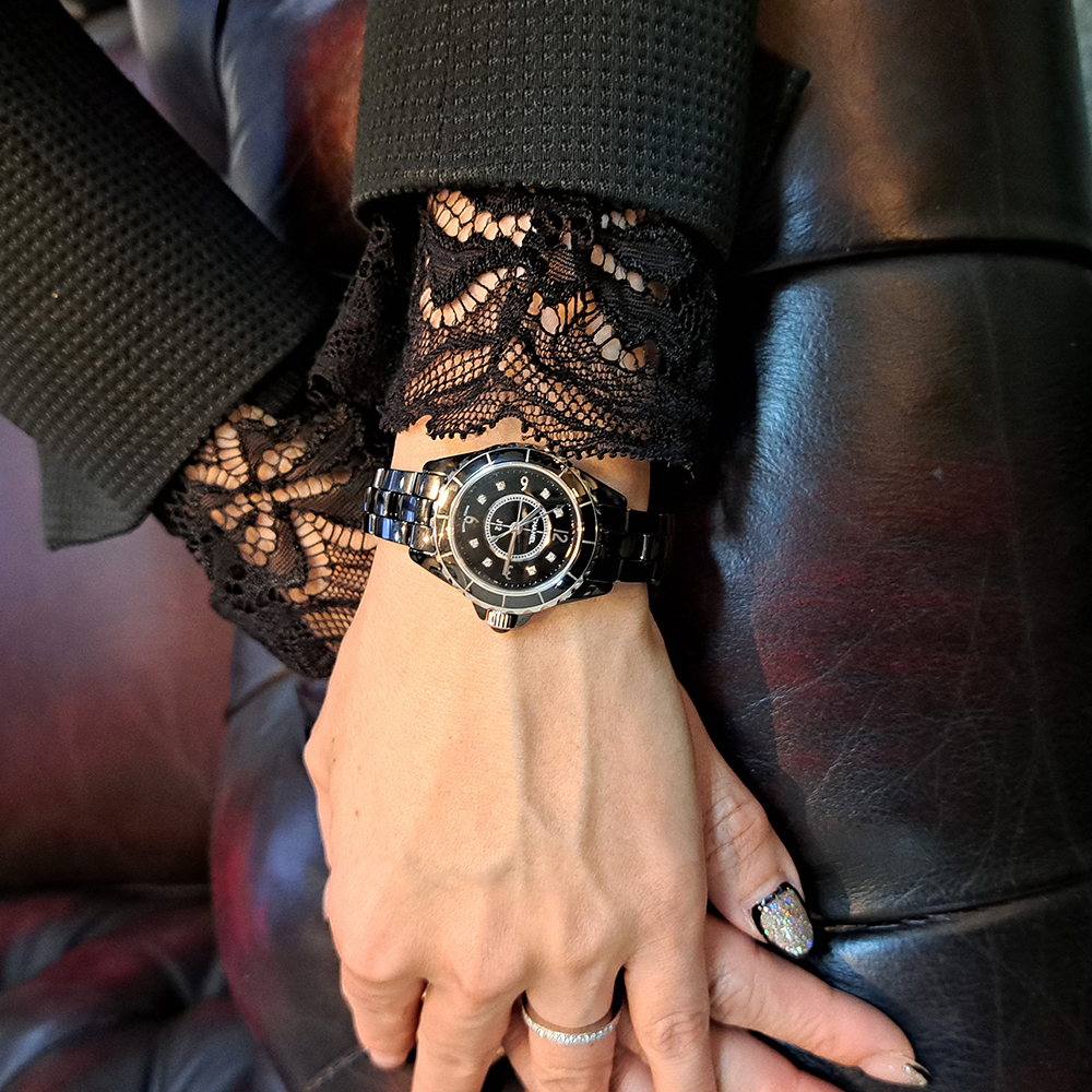 シャネル J12 H2569 ブラックセラミックが入荷致しました。29mmの可愛らしいケースサイズに、汚れや傷に強いブラックセラミックを採用し、ダイヤルには8Pの純正ダイヤモンドをセッティングしたゴージャスな逸品です。こちらの商品はルーペで拡大すると風防ガラスに極微細な傷やカケがありますが、肉眼では殆ど気にならない程度で、それ以外は目立った傷等のない綺麗な状態です。2025年11月に社内にて内部点検をし、バッテリーも交換しておりますので、安心してご使用して頂けます。