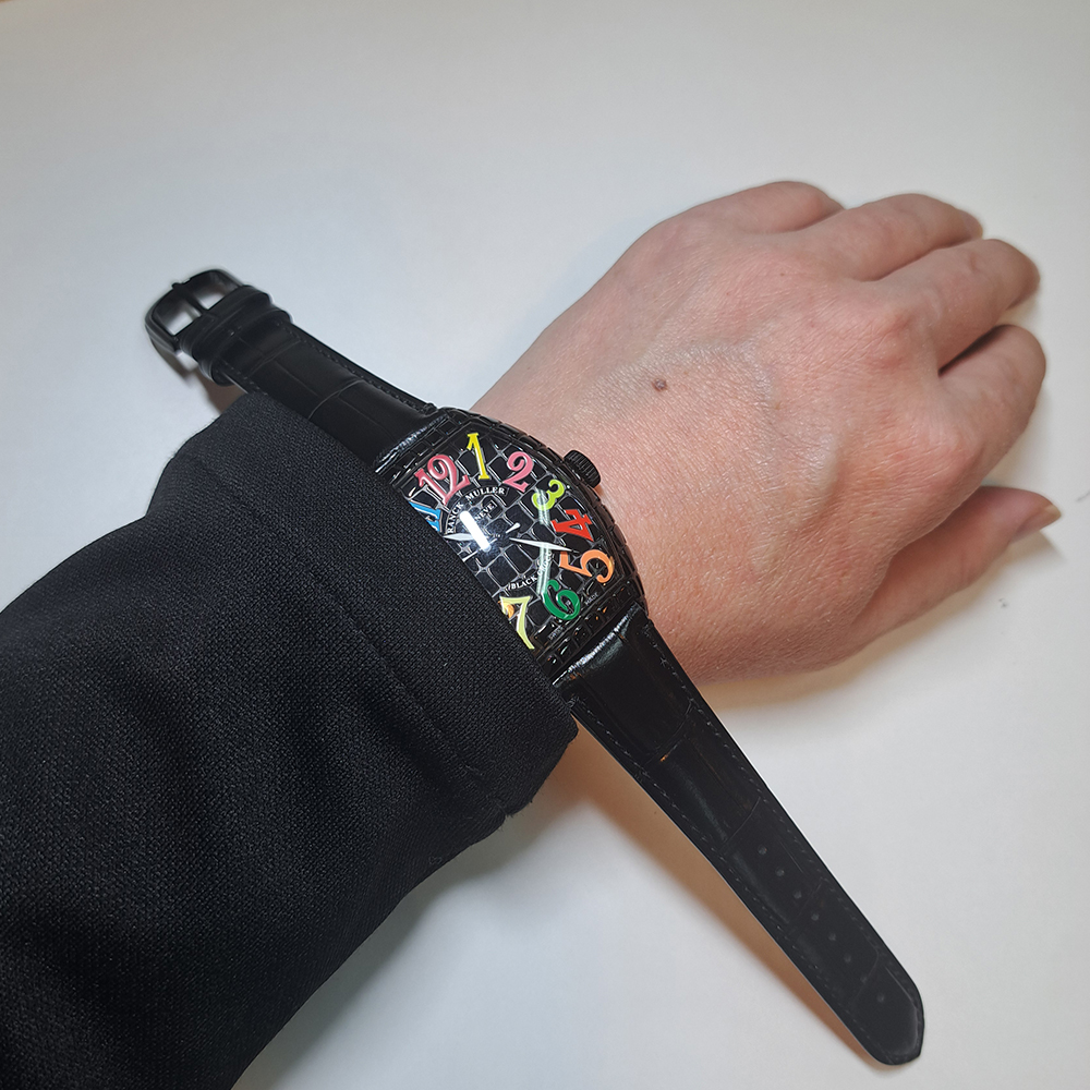 フランクミュラー ブラッククロコ 8880SC BLK CRO カラードリームが入荷致しました。ケース・文字盤はクロコダイルの竹符模様を繊細に作り込まれ、クロコダイルが秘める迫力を見事に表現されており、インデックスはカラフルなビザン数字が採用されています。ギャランティに2015年に国内正規販売店にて購入した記載があります。こちらの商品は目立った傷等の無い綺麗な状態です。