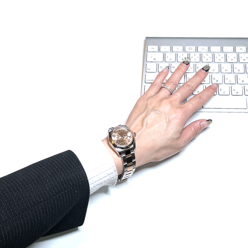 文字盤のフラワーモチーフが可愛らしくユニセックスサイズながら、女性におすすめの1本です。流通量がそれほど多くない文字盤ですので、お早めにお問い合わせください。