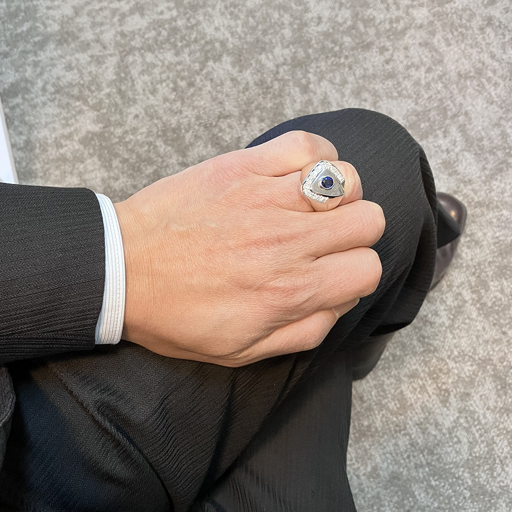 Pt900 ブルー サファイア 脇石 ダイヤモンド メンズ リングが入荷しました。主石に良質で内包物のないブルーサファイアをセッティングし、脇石にダイヤモンドを使用したメンズ リングです。