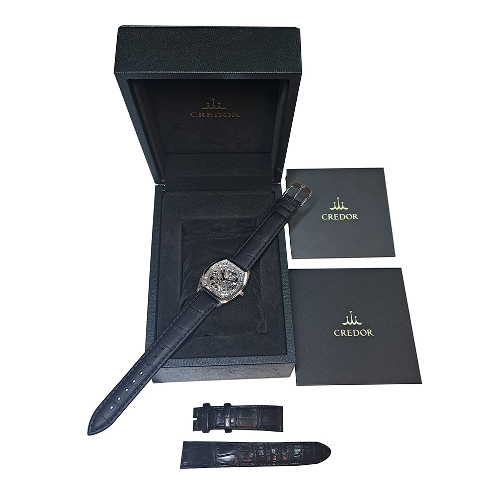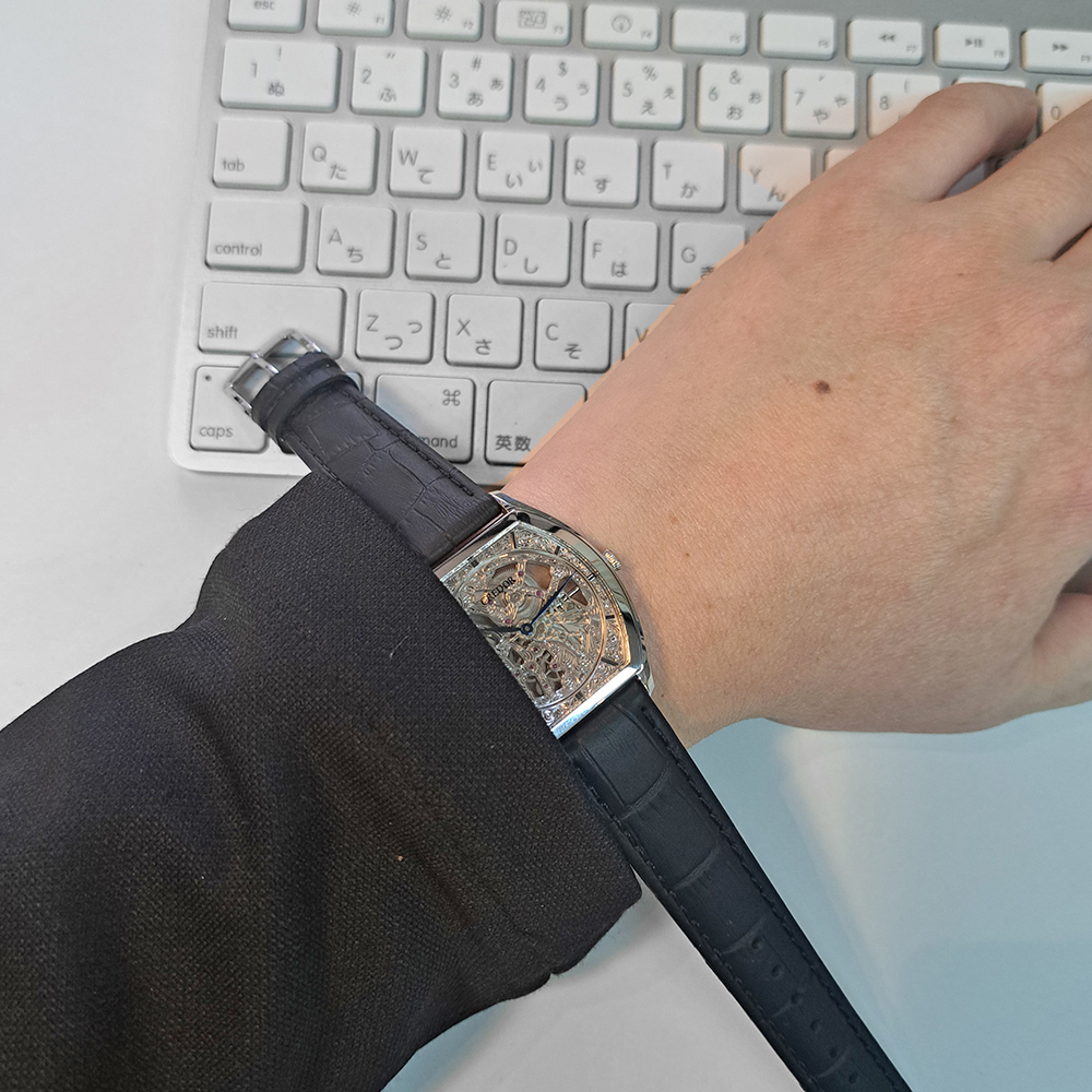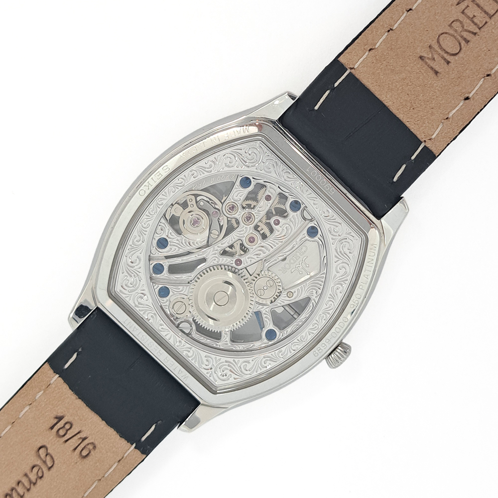 セイコー クレドール シグノ GBBD981が入荷致しました。プラチナ素材にスケルトンダイヤルが特徴的なモデルで、表側、裏側どちらからでもムーブメントを鑑賞する事ができます。こちらの商品は目立った傷等のない綺麗な状態です。ギャランティに2015年国内正規販売店にて購入した記載があります。