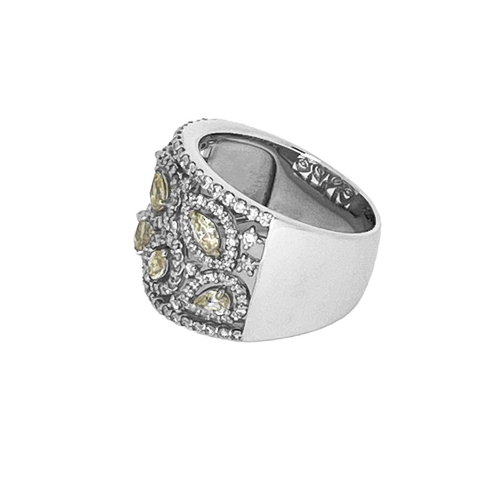 ダイヤモンド 1.50ct プラチナ リングが入荷しました。主石にベリーライトイエロー色でマーキスカットとペアシェイプカットの上質なダイヤを7石セットし、周囲にメレダイヤが豪華に輝くプラチナリングです。