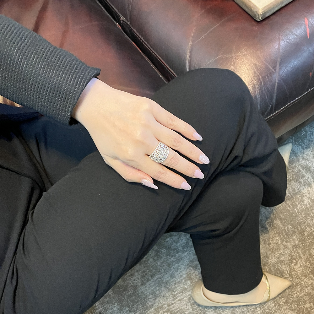 装着すると、指とおりがなめらかで着け心地が良いです。上質なダイヤモンドのきらめきが手元をエレガントに演出してくれます。