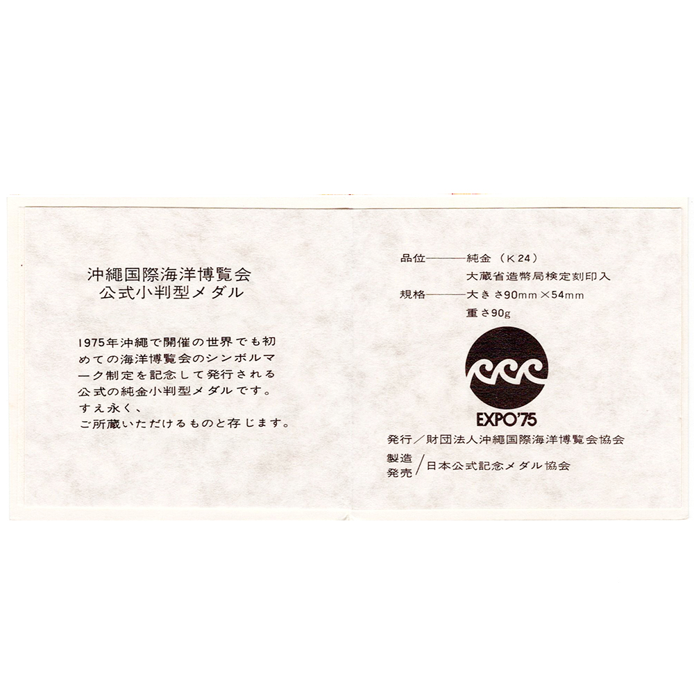 未開封 K24検定マーク付 純金製 1975年 沖縄国際海洋博覧会公式 小判 90.0g