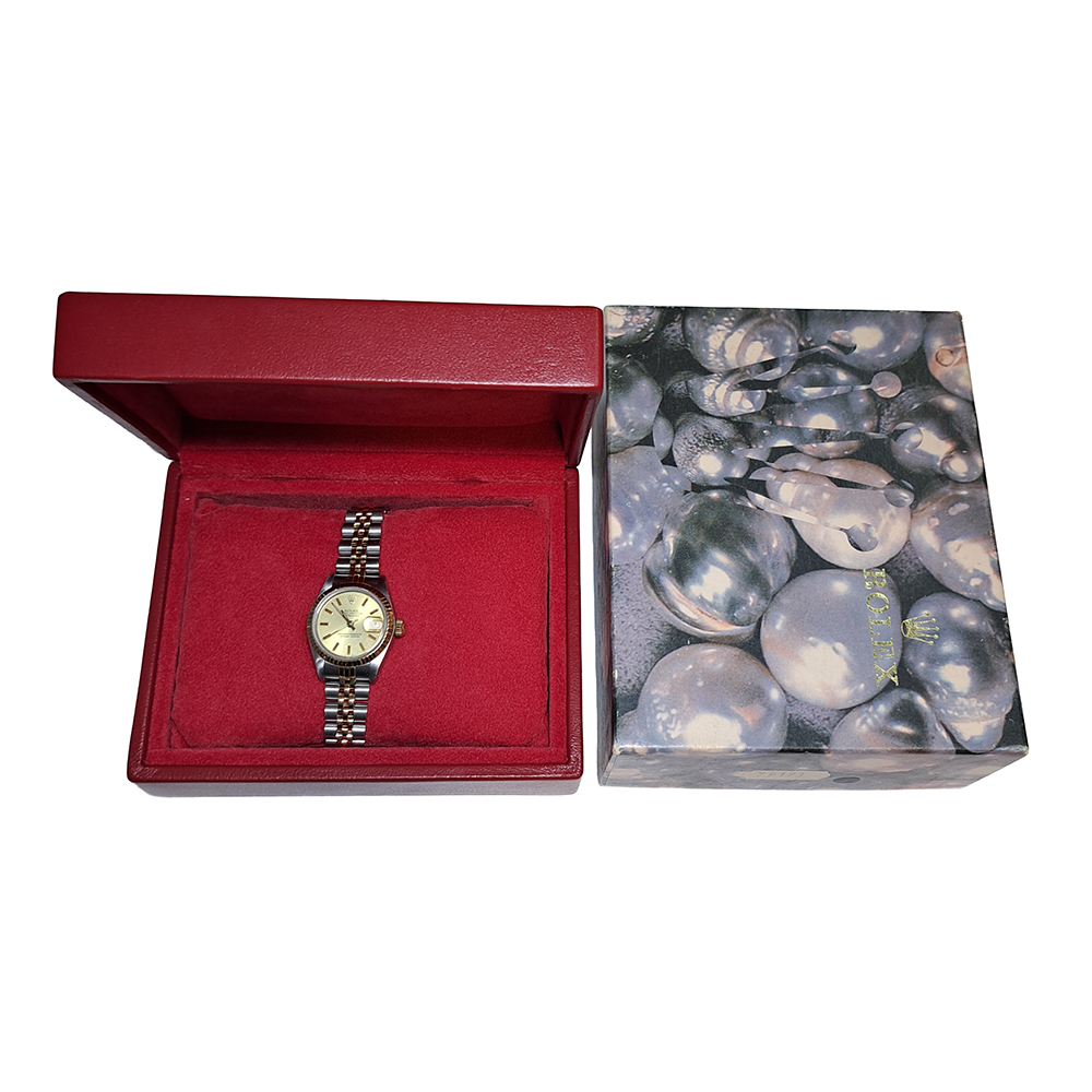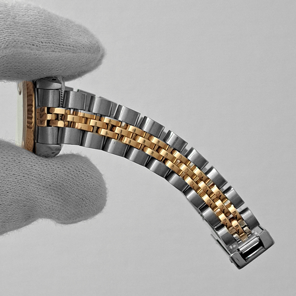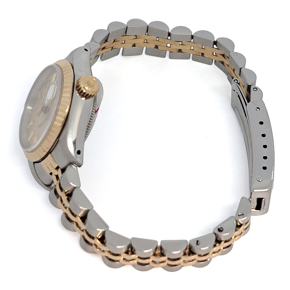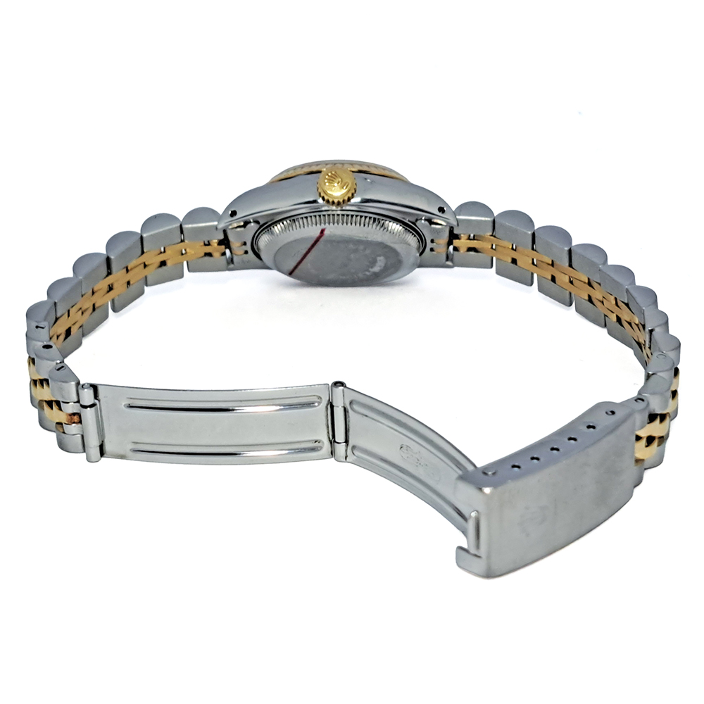 ロレックス デイトジャスト 69173 シャンパンゴールド が入荷致しました。シャンパンゴールドダイヤルにイエローゴールドとステンレススチールのコンビモデルです。ロレックス レディースの定番人気モデルのゴージャスな逸品です。こちらの商品はベルトに若干の伸びがあるのとルーペで拡大すると風防ガラスに極微細な傷が御座いますが、肉眼では殆どきにならない程度です。