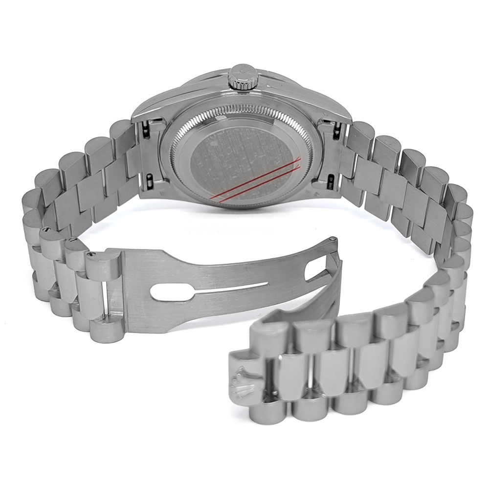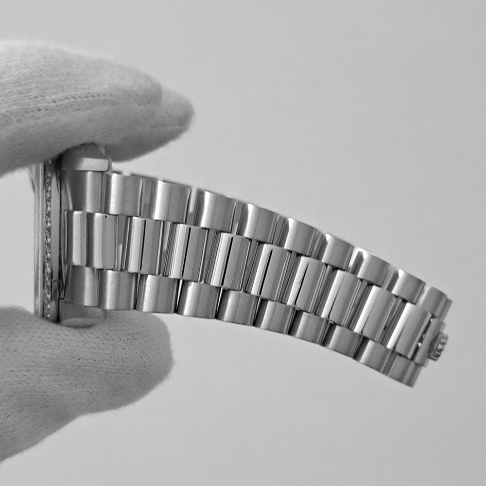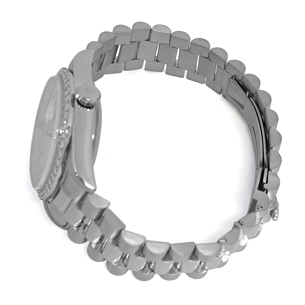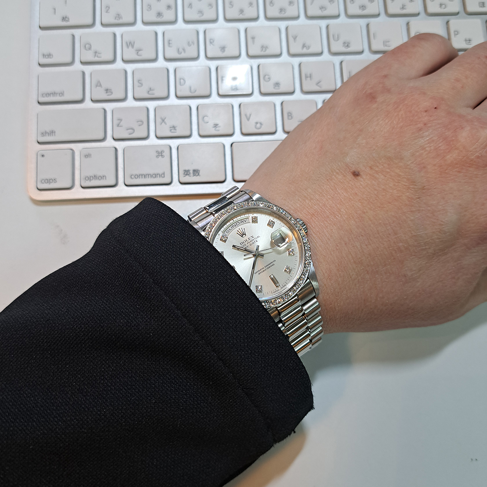 ロレックスの中でも最高級クラスのモデルで、プラチナ色で統一されており、ベゼルとインデックスのダイヤとの相性も抜群です。