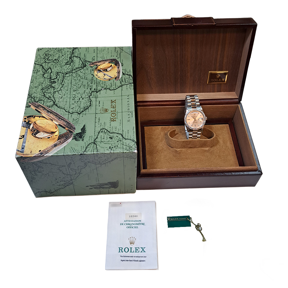 ロレックス デイデイト 18346Aが入荷致しました。抜群の高級感を誇るプラチナ無垢素材にベゼルとインデックスには純正ダイヤモンドをセッティングしたゴージャスな逸品です。こちらの商品は目立った傷等の無い綺麗な状態です。ギャランティにイギリスにて購入した記載があります。