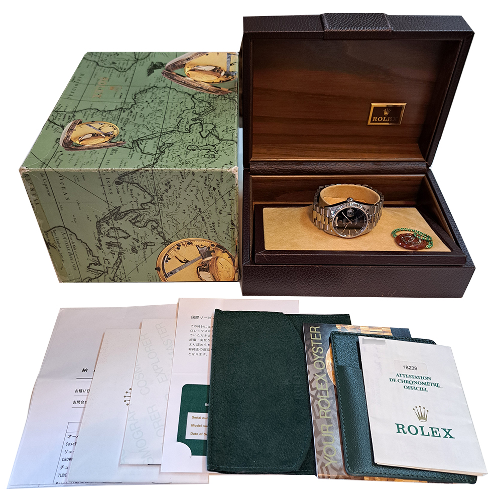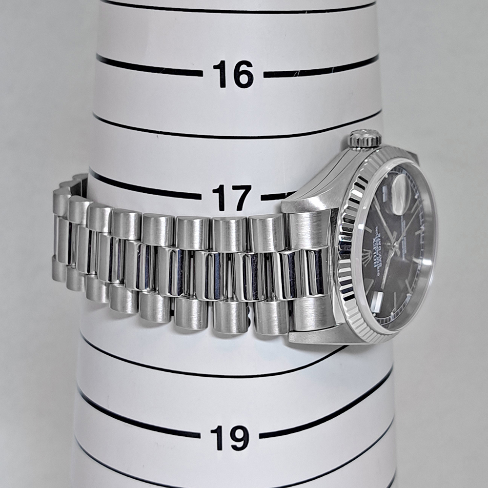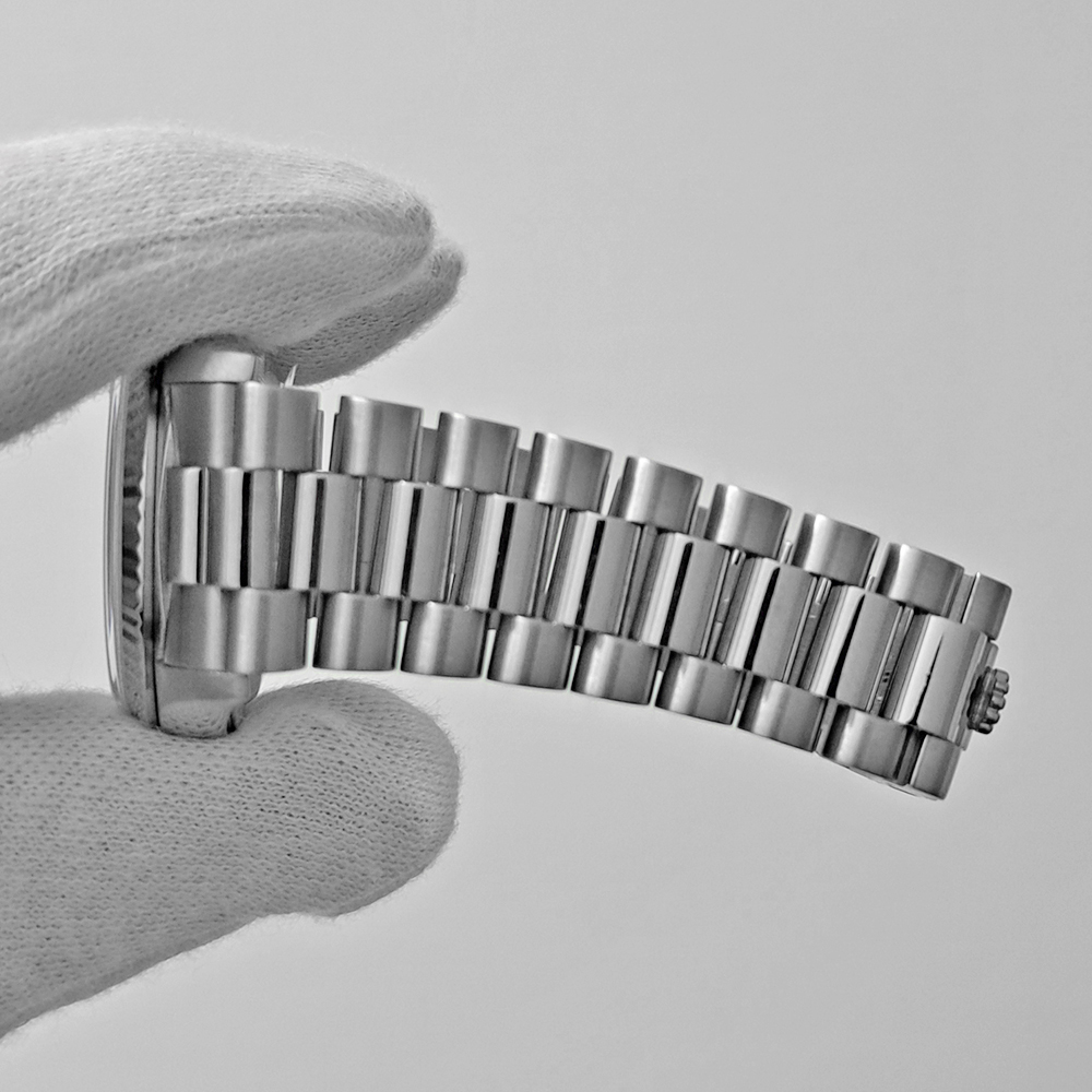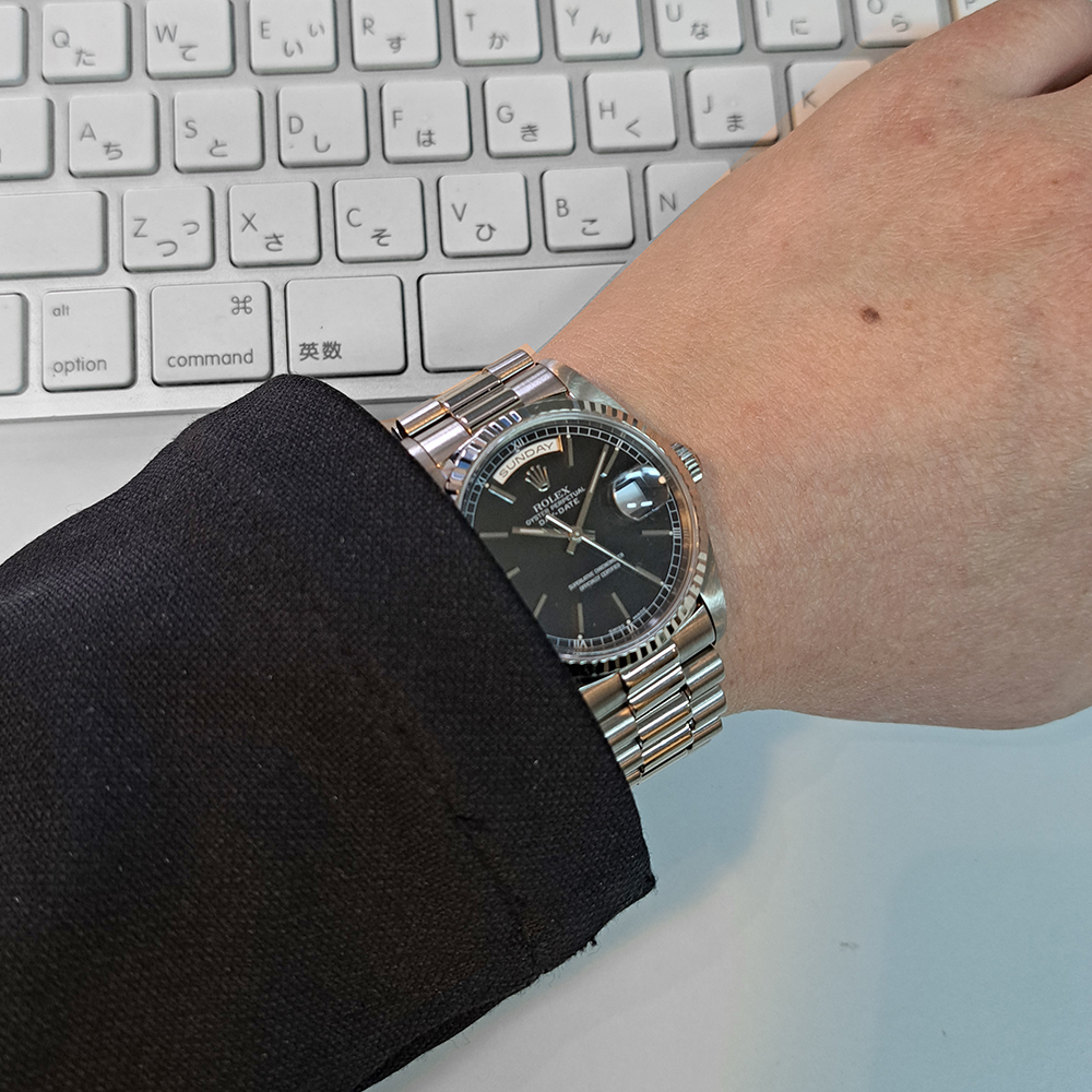 ロレックス デイデイト 18239 ホワイトゴールド無垢 ブラックダイヤルが入荷致しました。ホワイトゴールド無垢素材にブラックダイヤルの高級感とシックな雰囲気を併せもった逸品です。視認性や機能性にも優れた万能な腕時計です。こちらの商品は目立った傷等の無い綺麗な状態です。ギャランティに2000年9月にスイスにて購入した記載があります。