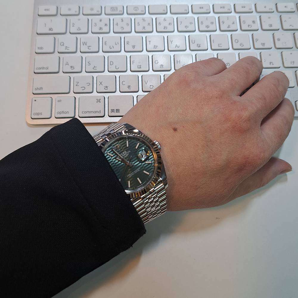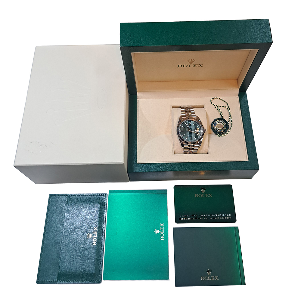 ロレックス デイトジャスト41 126334 ミント/フルーテッド ジュビリー が入荷しました。文字盤のミントグリーンのフルーテッドモチーフになっており、見る角度によって幾何学的に表情を変え、見ていて飽きのこない美しい文字盤となっております。こちらの商品は目立った傷等の無い綺麗な状態です。ギャランティに2023年に購入した記載があります。