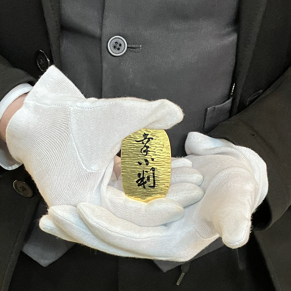 純金製 小判 大阪淀屋橋 尚美堂造が入荷しました。表面には「幸小判」の墨入れ文字、裏面には「尚美堂」「純金」と検定マークの打刻を施しています。