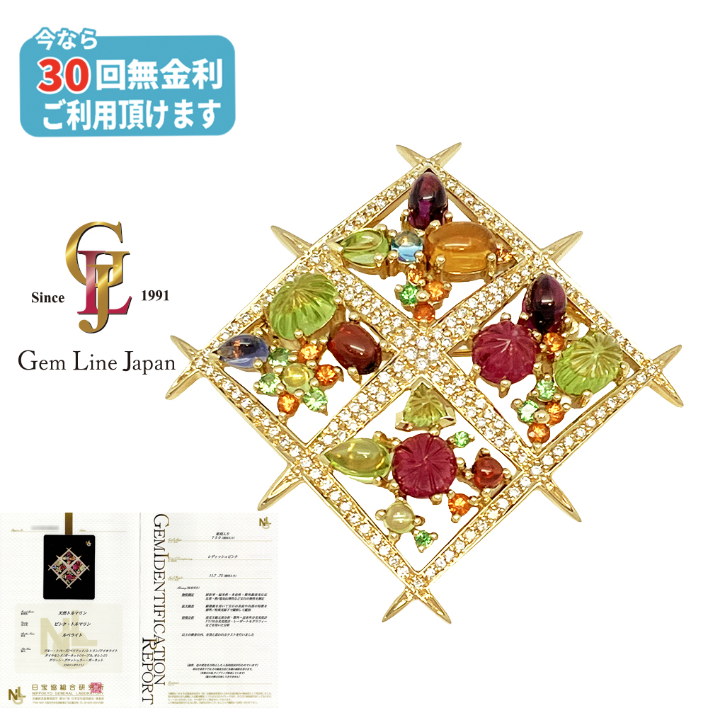 K18 19.23g 天然ピンクトルマリン 11.7ct マルチカラーストーン ダイヤモンド 0.75ct 日宝協総合研究所鑑別書付 ブローチ