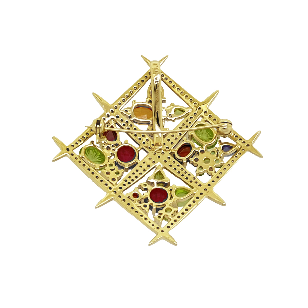 K18枠にマルチカラーストーンをセッティングしたブローチが入荷致しました。主石にピンクトルマリンを使用し、周囲にブルートパーズ、ベリドット、シトリン、アイオライト、ガーネット(パープル、オレンジ)、グリーングロッシュラーガーネット、ダイヤモンドを贅沢にセッティングした豪華なお品です。