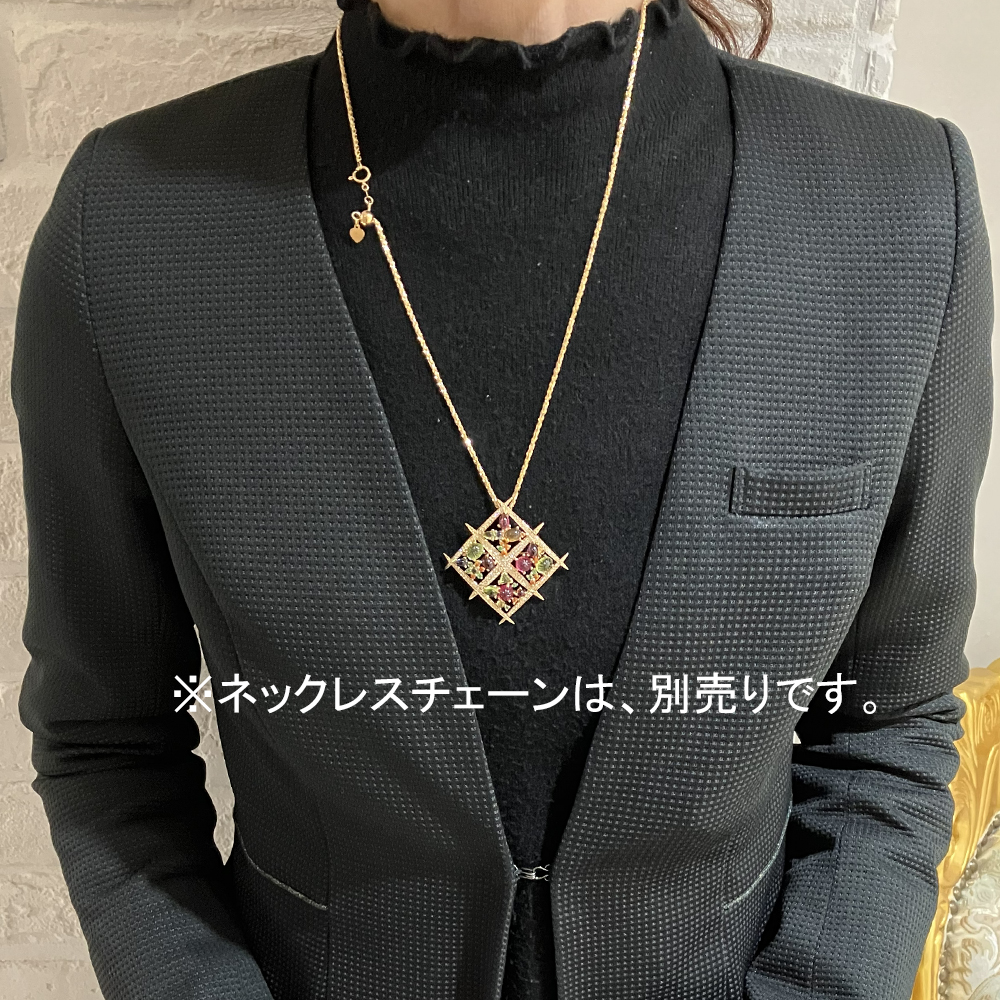 カラフルな石がセッティングされており、ゴージャスで華やかな印象を与えてくれるブローチです。ペンダントトップとしてもご使用いただけます。※装着写真のチェーンは別売です。