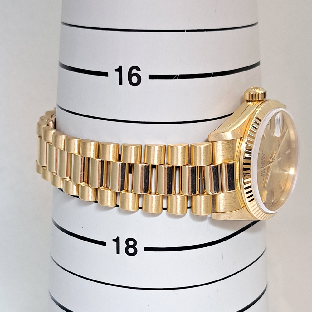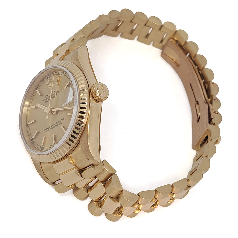 ロレックス デイトジャスト 68278 ボーイズ 金無垢 が入荷致しました。ロレックスの定番人気モデルで金無垢素材に小振りながらも煌びやかでしっかりとした存在感のある一本です。ギャランティに1996年10月にバーレーンにて購入した記載があります。ベルトに若干の伸びがありますが、ご使用には問題ございません。ルーペで拡大すると風防ガラスに微細なカケがありますが、肉眼では殆ど気にならない程度です。2026年2月に当社提携工房にてオーバーホールを実施しており、安心してご使用して頂けます。