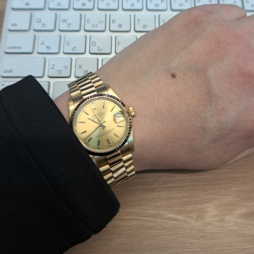 シャンパンダイヤルはイエローゴールドの無垢ケース・ブレスに対して非常に相性が良く、全体の統一感が強く引き立ち、腕回りをゴージャスに演出してくれます。