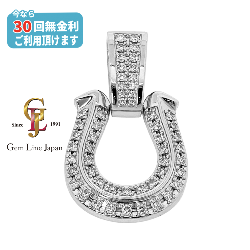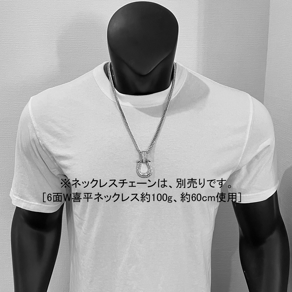 馬蹄のモチーフは、 幸運・成功などの意味がありラッキーアイテムとして古くから親しまれており、叶えたい夢や達成したい目標がある人におすすめです。 装着するとプラチナ台にセットしたダイヤがキラキラと輝きゴージャスな装いにしてくれます。バチカンは非常に大きく100gの喜平ネックレスも容易に通ります。お手持ちのネックレスに合わしてご使用ください。 ※装着写真のチェーンは別売です。100g・60cmの6面ダブル喜平ネックレスを使用しています。