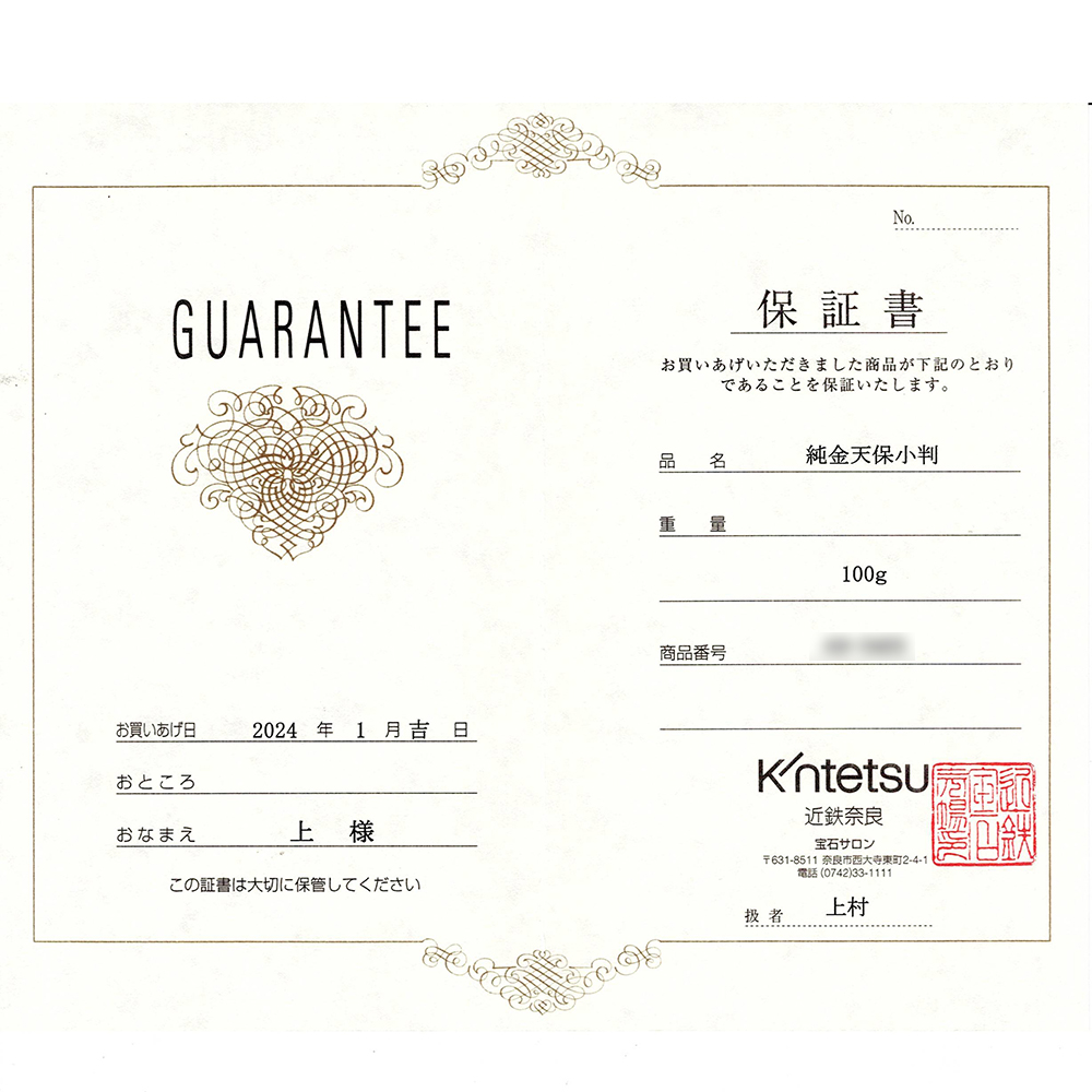 100.00g【未使用】K24 検定マーク入 純金製天保小判
