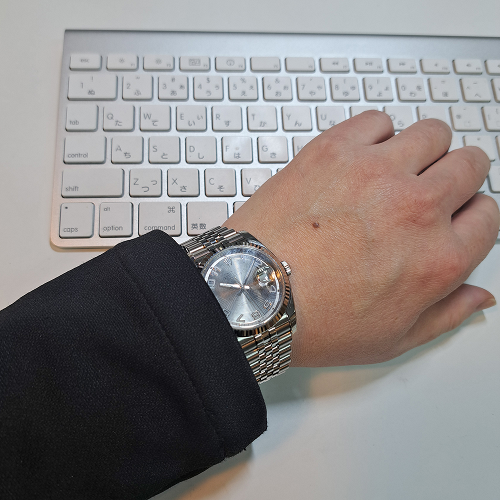 ロレックス デイトジャスト 116234 コンセントリックが入荷致しました。同心円を意味するコンセントリックの文字盤は、中心部分・アラビアインデックス部分・外周部分で仕上げを使い分けられた珍しいデザインの文字盤です。デイト表示は偶数が黒、奇数が赤の表示となっており、他のモデルとは少し違った楽しみ方ができます。ギャランティに2005年に国内正規販売店にて購入した記載があります。こちらの商品は目立った傷等の無い綺麗な状態です。