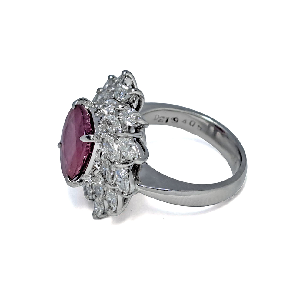 世界最高峰の品質を誇るビルマ産の赤みがかった深紅の美しい色味を帯びた透明度の高い大粒のルビー4.05ctとダイヤモンド2.19ctをセッティングしたゴージャスなプラチナリングが入荷致しました。脇石のダイヤモンドもキラキラとした照りのある上質のダイヤモンドです。