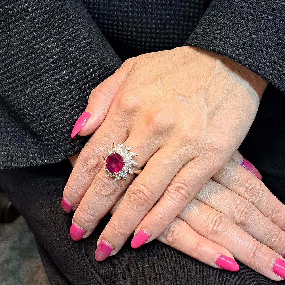 脇石のダイヤの眩い輝きが、ビルマ産ルビーのお色味を引き立て、より一層華やかな印象を演出してくれます。肉厚なリングは、指にしっくりと馴染む着け心地で、とても安定感があります。