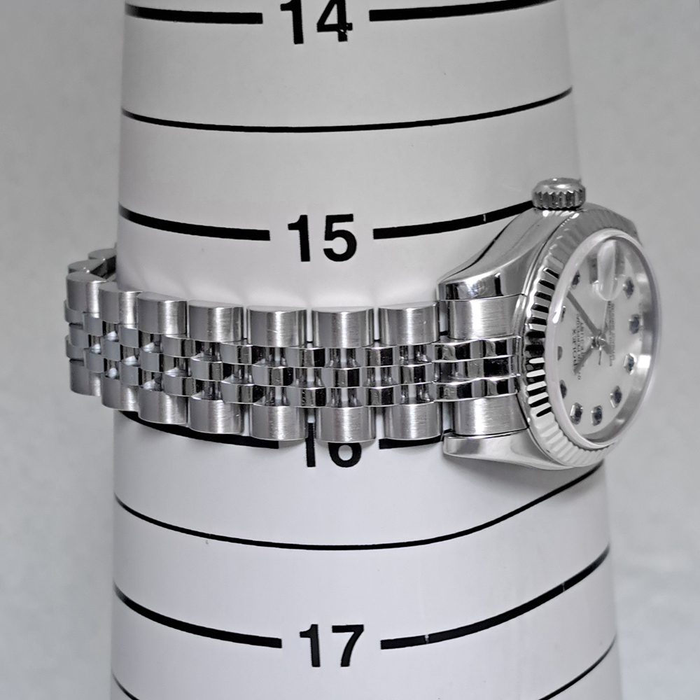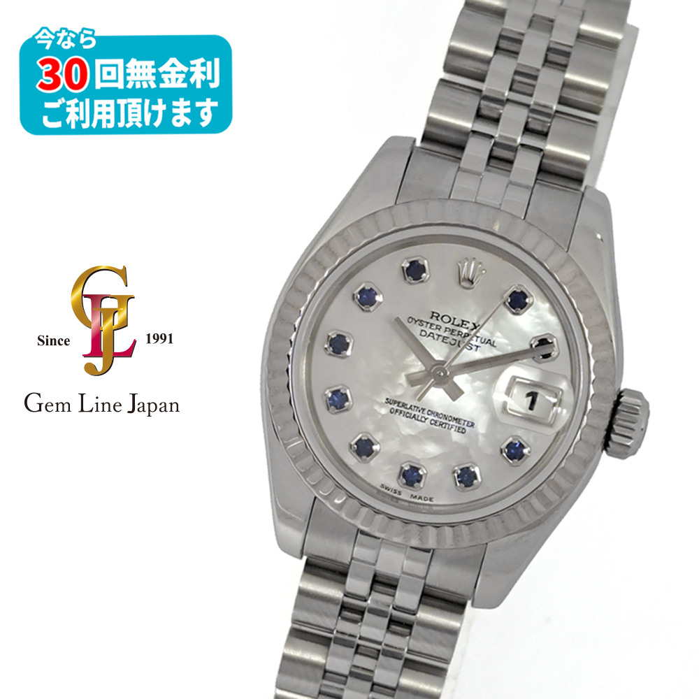 ロレックス デイトジャスト 179174NGSが入荷致しました。ステンレスとホワイトゴールド素材に良く合う美しい輝きを放つホワイトシェルダイヤルに10Pのサファイアインデックスをセッティングしたゴージャスなモデルです。こちらの商品は目立った傷等の無い綺麗な状態です。