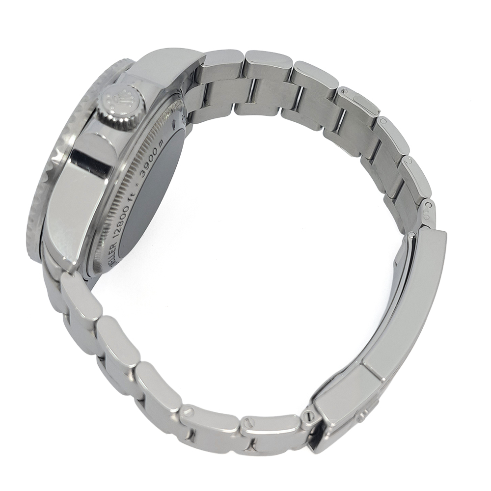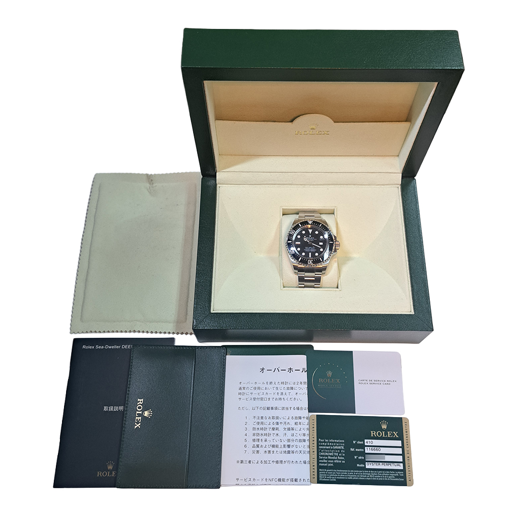 ロレックス シードゥエラー ディープシー 116660 が入荷致しました。2008年〜2018年まで製造されたモデルで、最高級の防水性能を誇ります。116660には3種類のダイヤルが有り、こちらは2008年から約1年間のみ流通した稀少価値の高いマーク1ダイヤルとなっております。こちらの商品はルーペで拡大するとラグに微細な打痕がありますが、肉眼では殆ど気にならない程度で、それ以外は目立った傷などの無い綺麗な状態です。ブレスレットに一部保護シールが付いています。